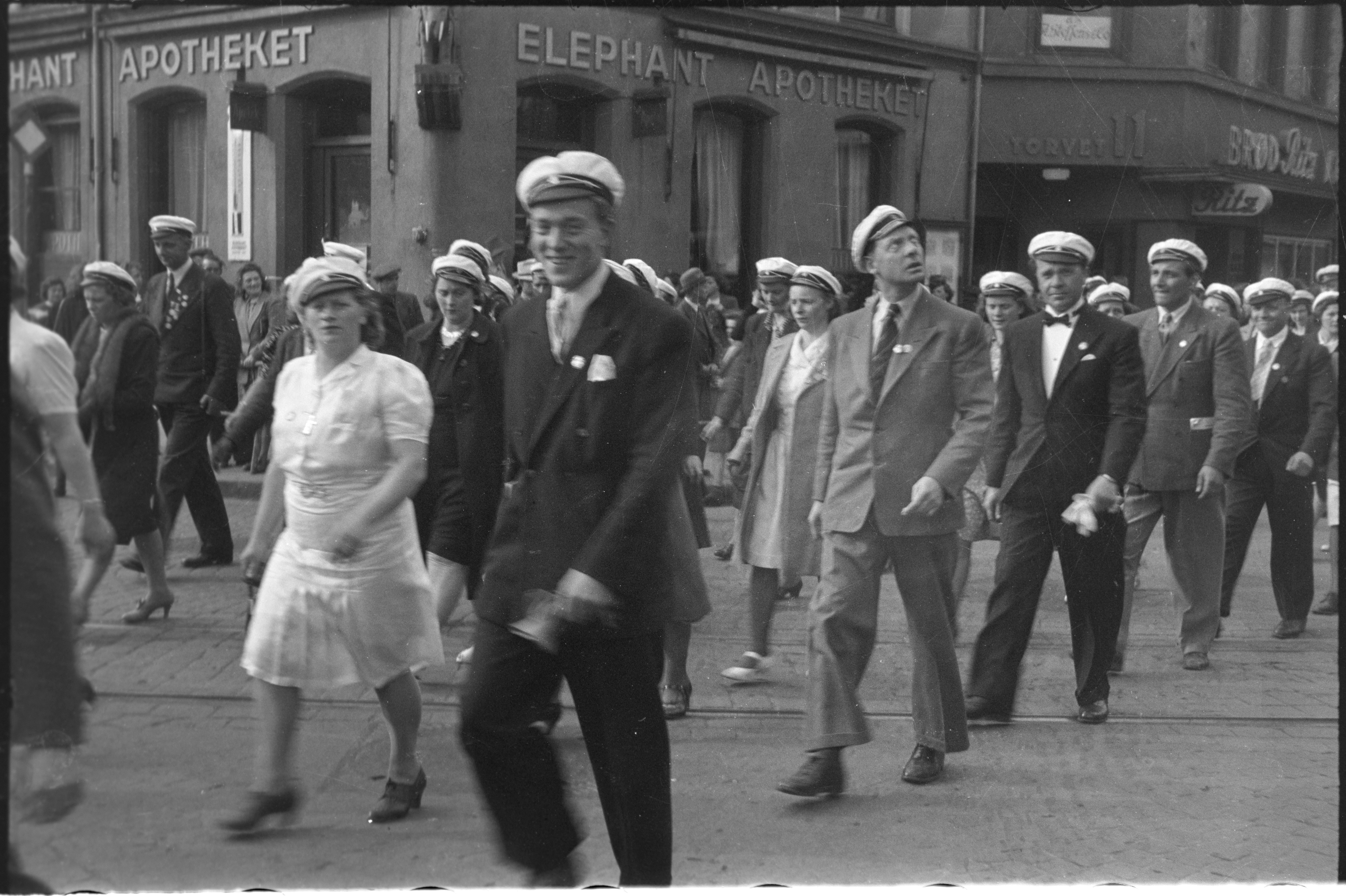 Fra sangerstevne i Oslo pinsen 1946. Deltakerne passerer gjennom Stortorvet. Elephant-Apotheket i bakgrunnen.