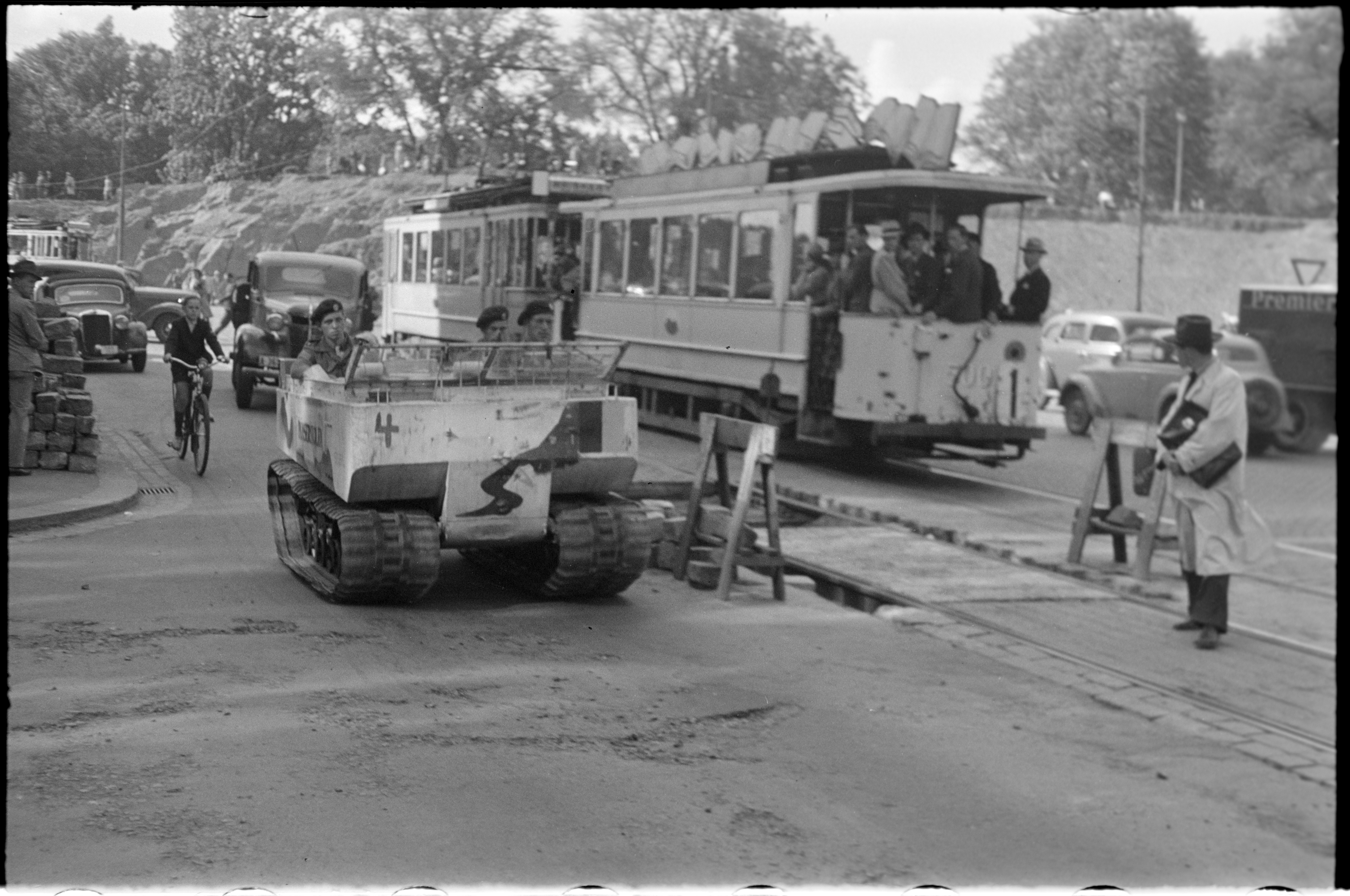 Militære kjøretøy og to trikker i Henrik Ibsens gate.