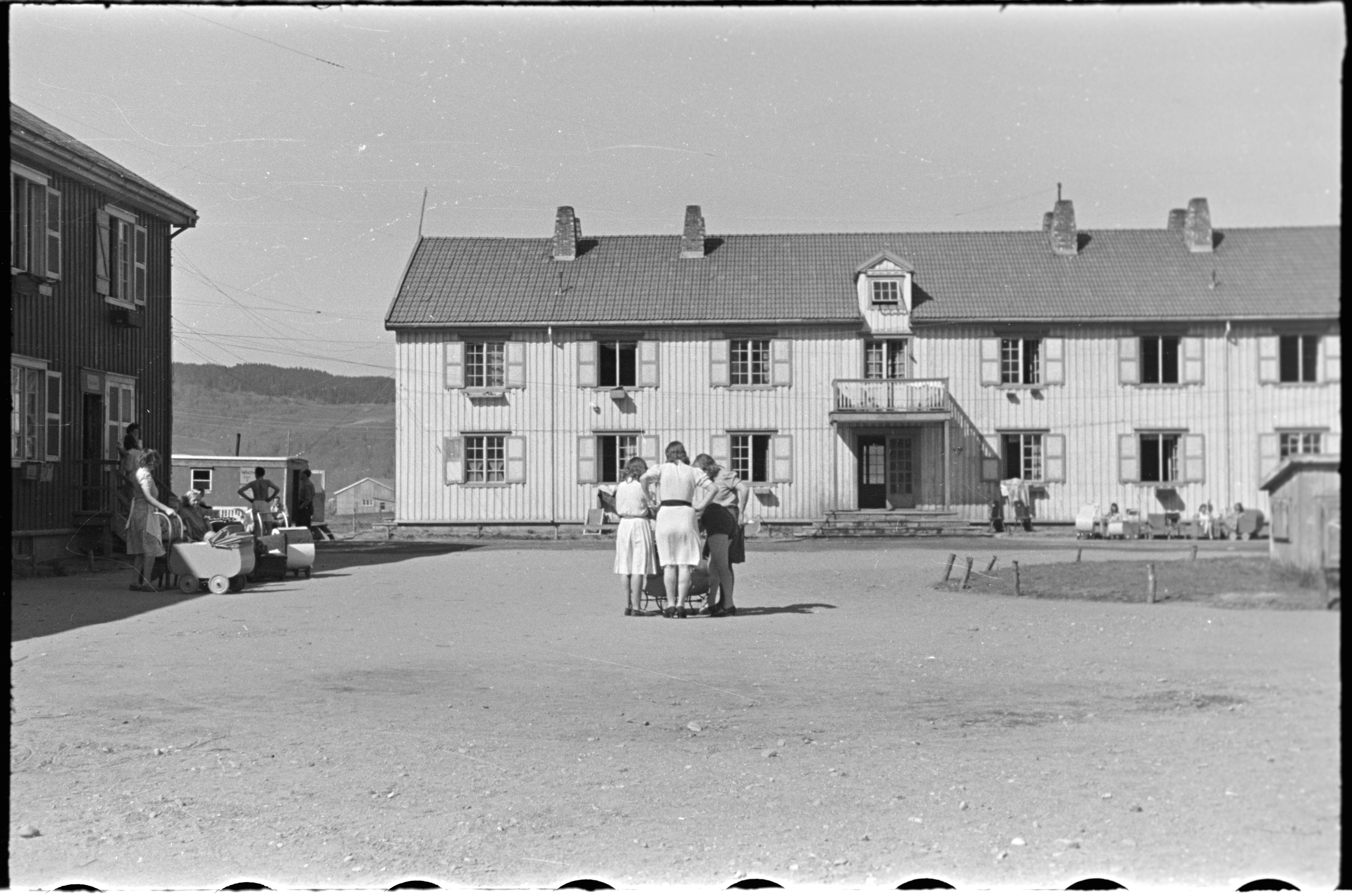 Kvinner på gårdsplassen i Øysand leir. En rekke barnevogner.