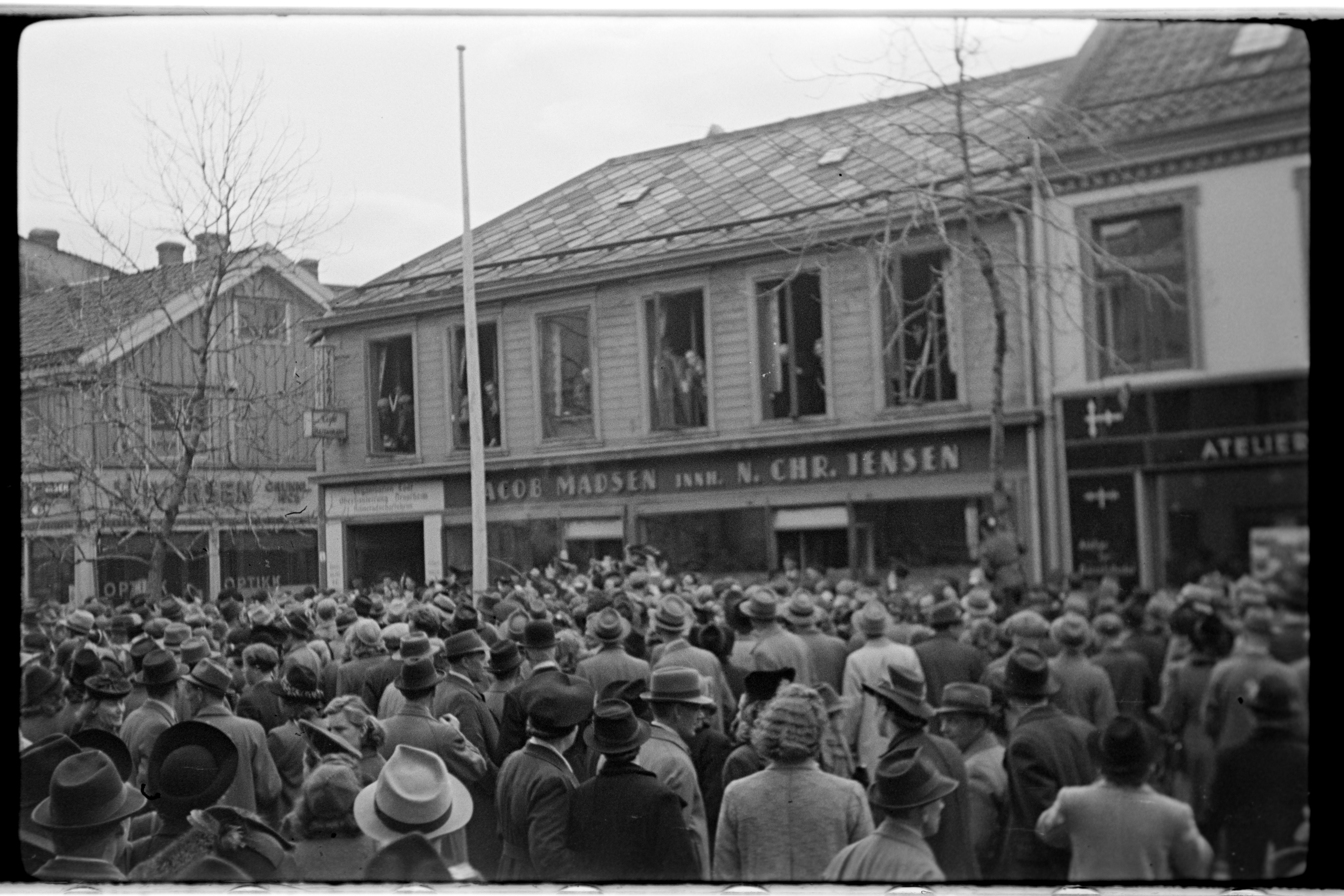 Frigitte fanger vender tilbake fra Falstad etter andre verdenskrigs slutt. En større folkemengde i Nordre gate. Til venstre ses Nordre gate 2. Midt i bildet Nordre gate 4 med Jacob Madsen Trikotagefabrik og lengst til venstre et skilt med "Organisation Todt". Til høyre ses deler av Nordre gate 6 med fotograf Schrøders atelier.