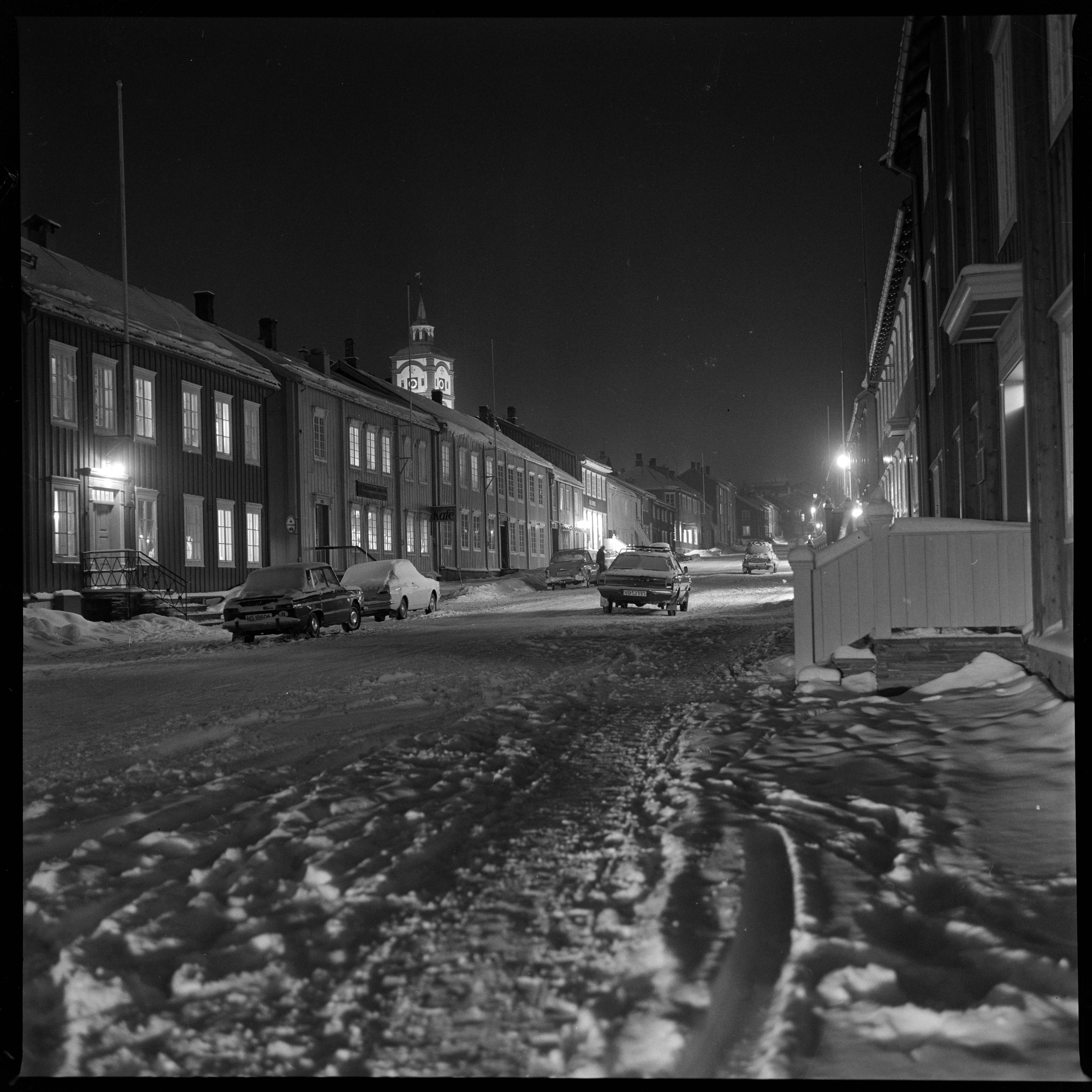 Kveldsstemning med snø i Kjerkgata i Bergstaden Røros.
