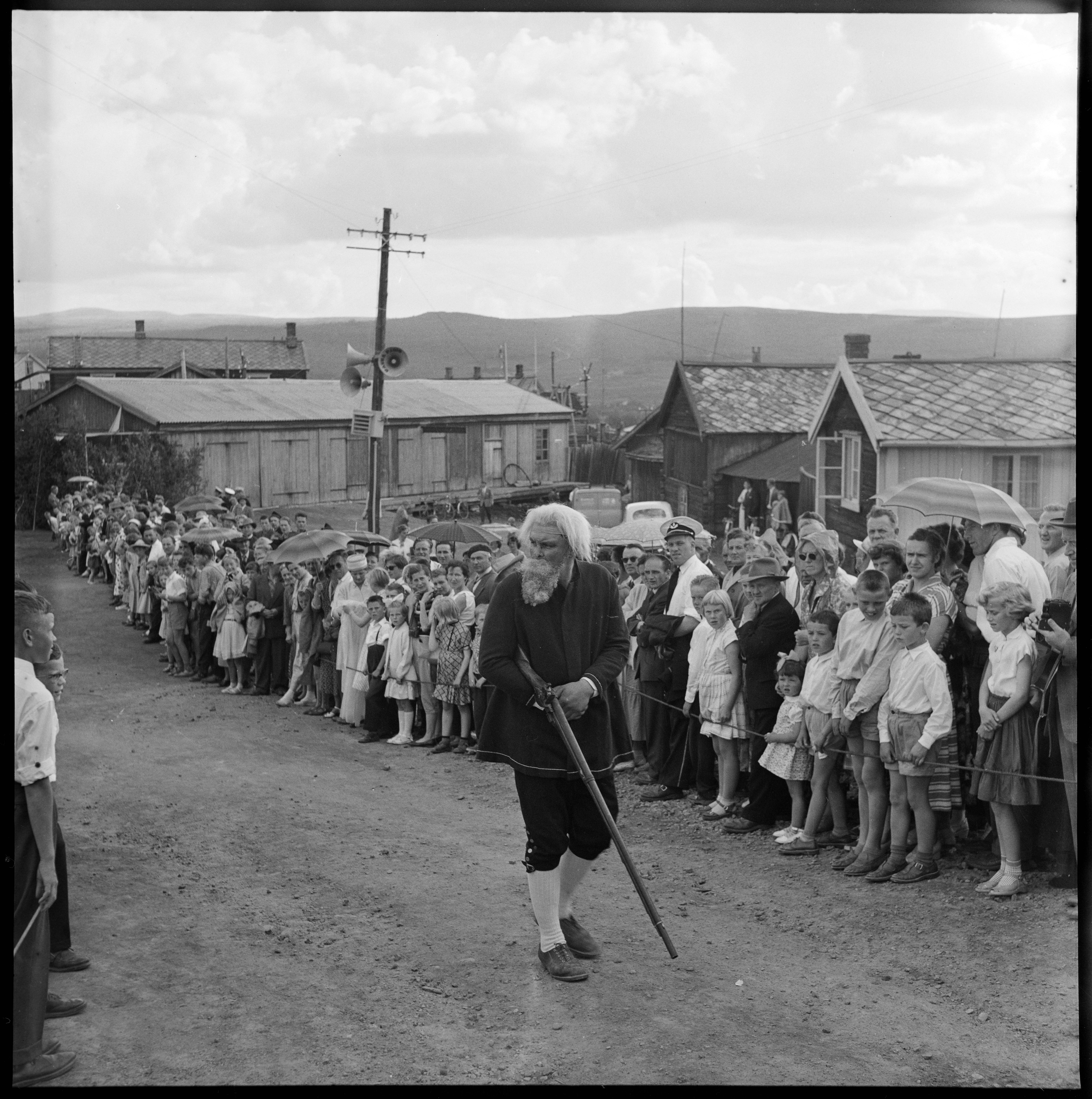 Bergmannsdagen. En mann med gevær. Publikum på begge sider av veien han går på.