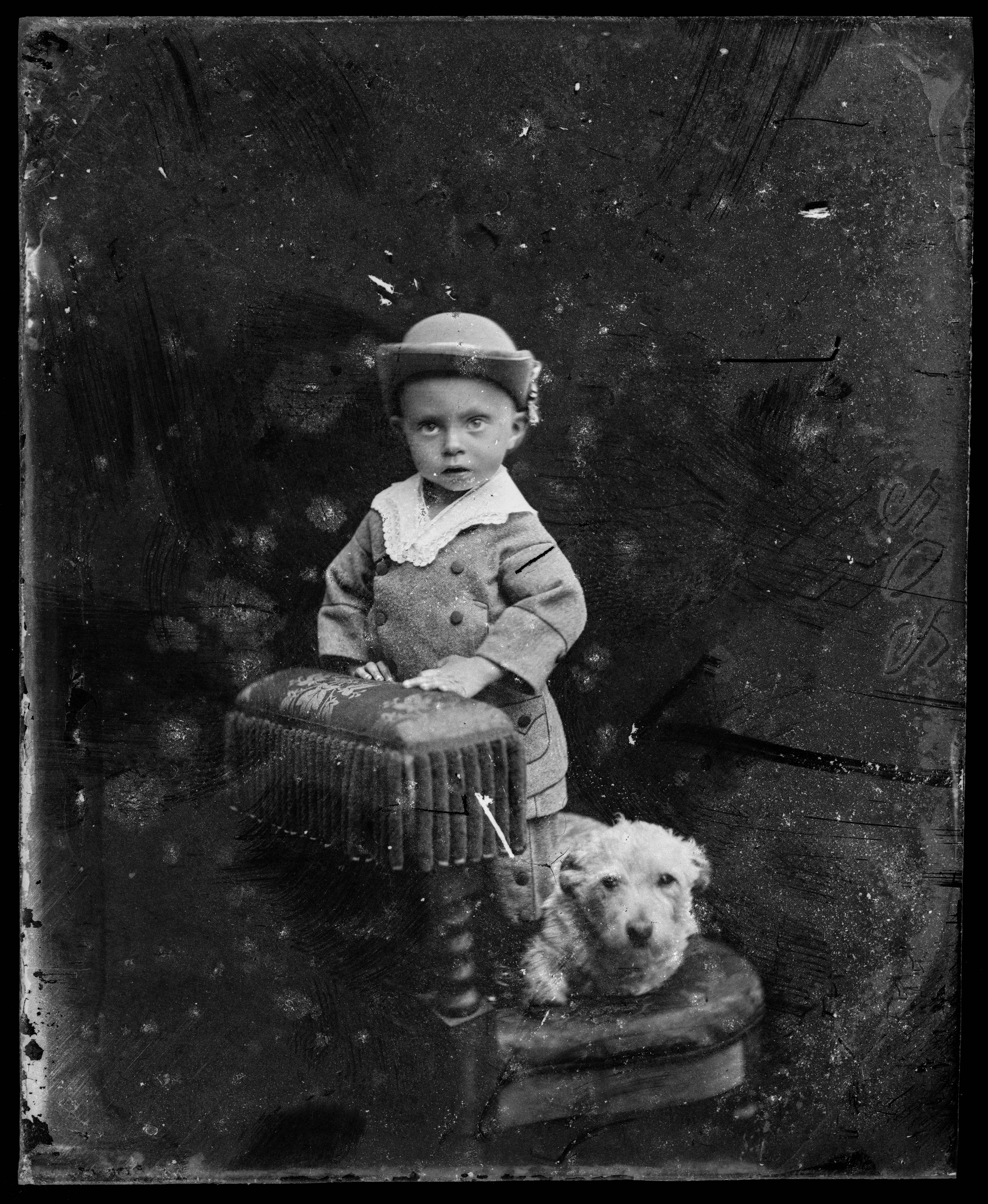 Portrett av et barn på en stol med en hund liggende ved siden av seg.