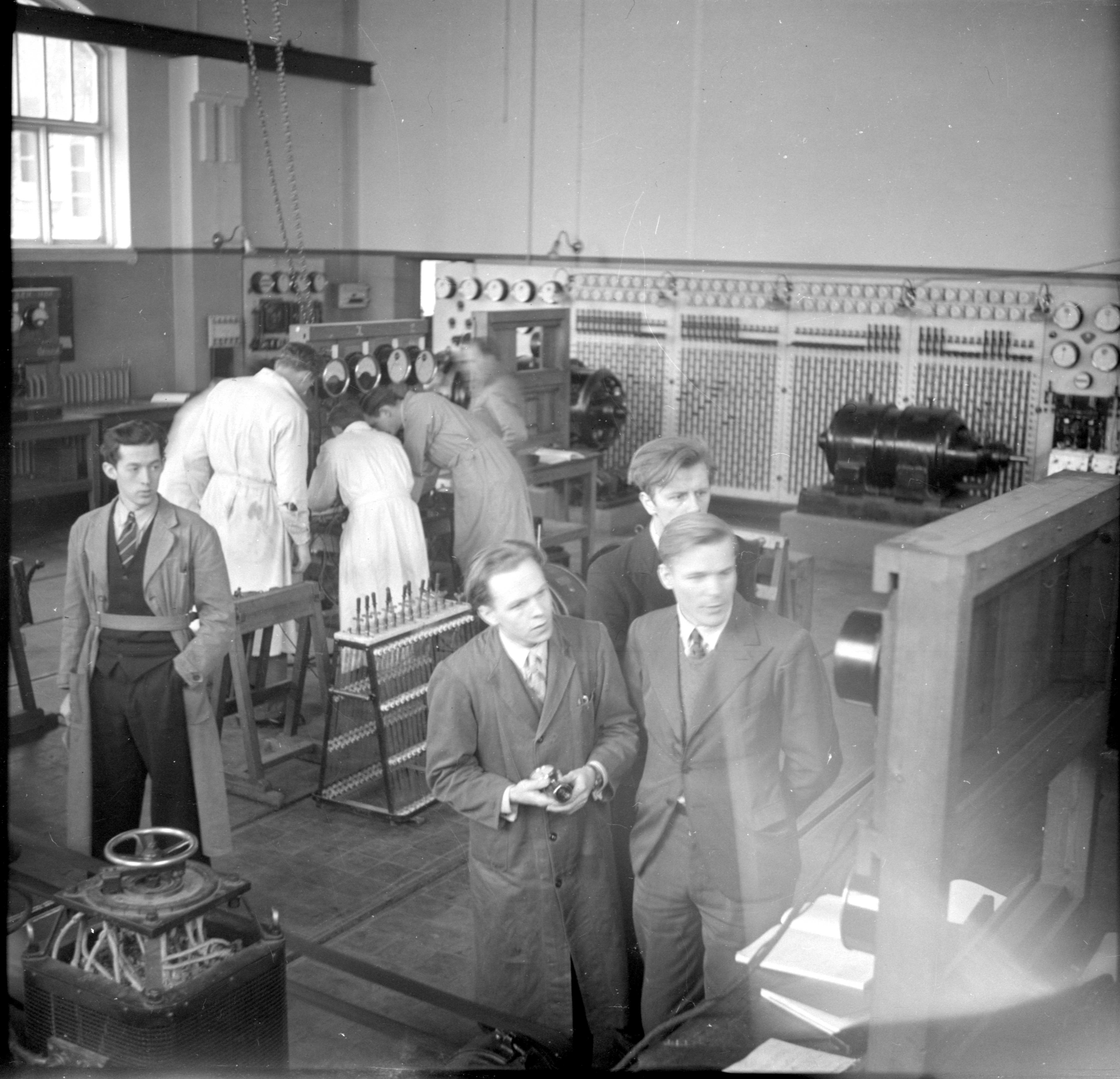 Ni personer står i et lokale for elkraft. Flere av personene er ikledd dress og frakk. Omkring i rommet står ulike apparater og måleinstrumenter. Bildet er tatt inne på et laboratorium ved NTH. Mellom 1940 og 1943 var Thor Bach student på elkraftlinjen ved NTH før han flyktet til Sverige vinteren 1943.