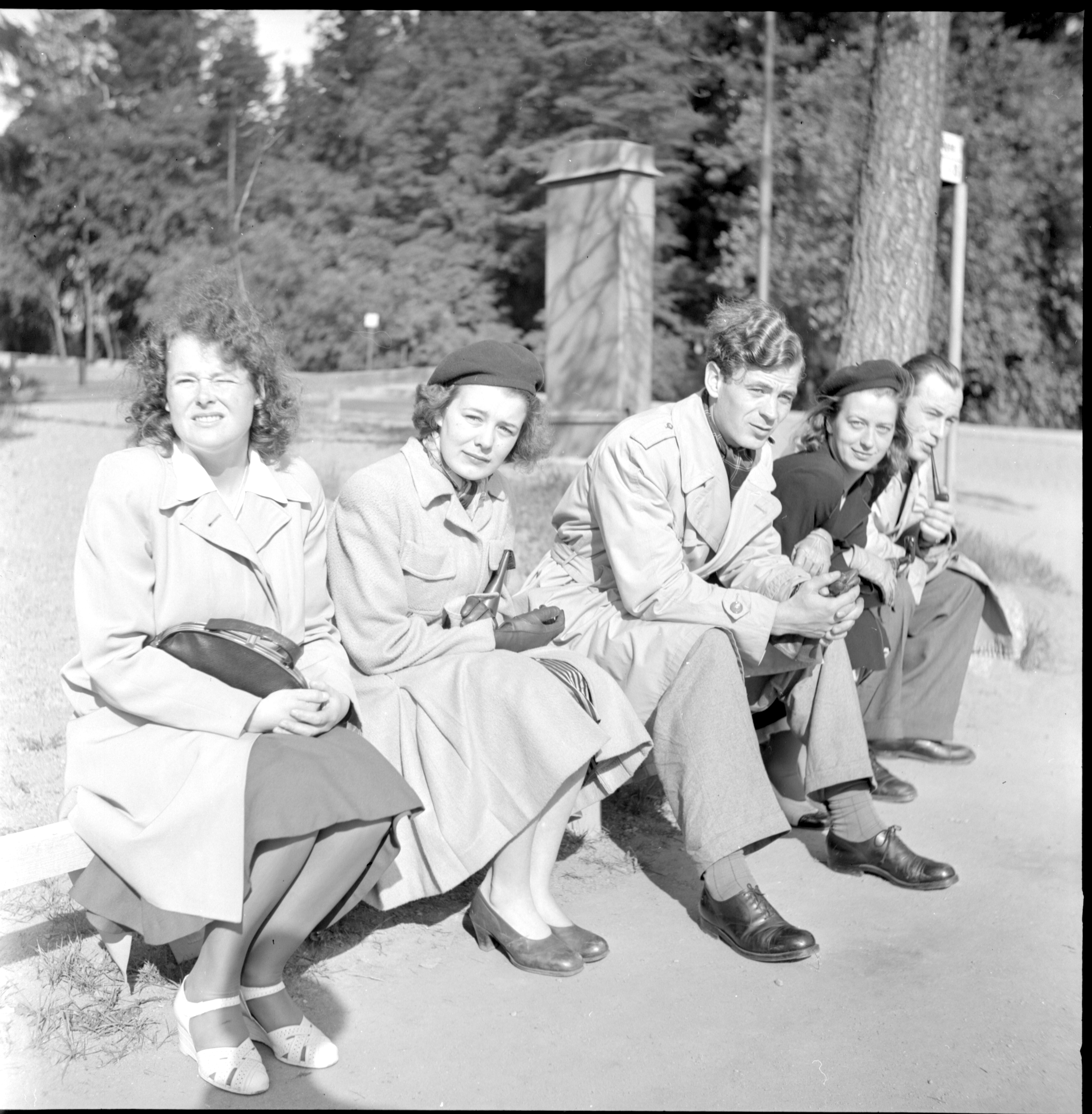 Fem personer, tre kvinner og to menn, sitter på en benk i forgrunnen. Benken står langs en vei. Noen skilt står langs veien. Lengst bak ligger en skog. Mannen i midten av gruppen er en av Thor Bachs kolleger ved den norske legasjonen i Stockholm og refereres til som "Brand" i Bachs fotoalbum.