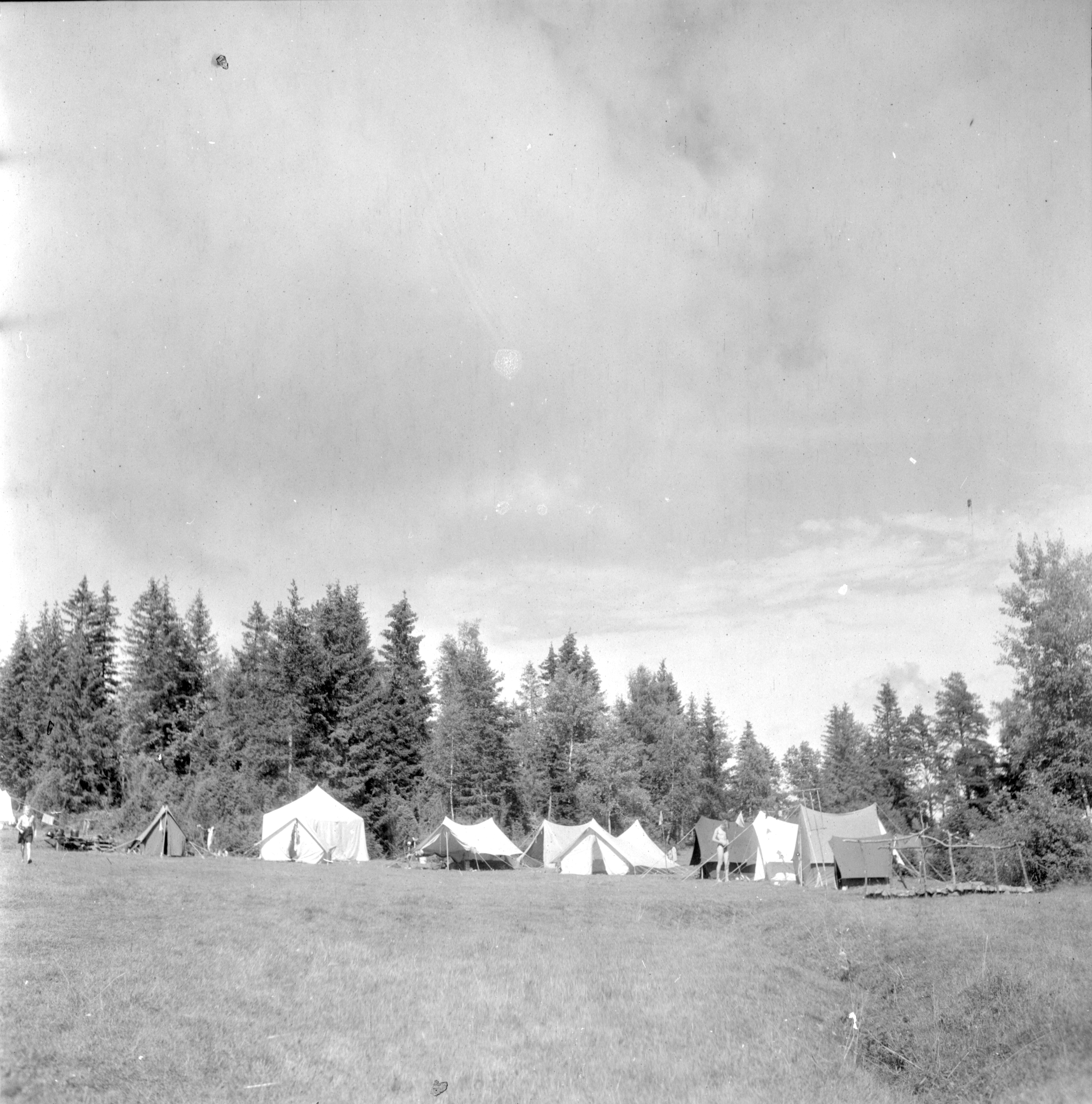 En åpen eng med kort gress. I bakgrunnen en skog. Langs skogkanten står en teltleir med ni telt. To personer står blant teltene. Personen til venstre er i bar overkropp og går mot fotografen, personen til høyre er kledd i svømmetøy. Bildet er trolig tatt i sammenheng med en speidersamling under perioden Thor Bach tilbrakte i landflyktighet mellom 1943 og 1945.