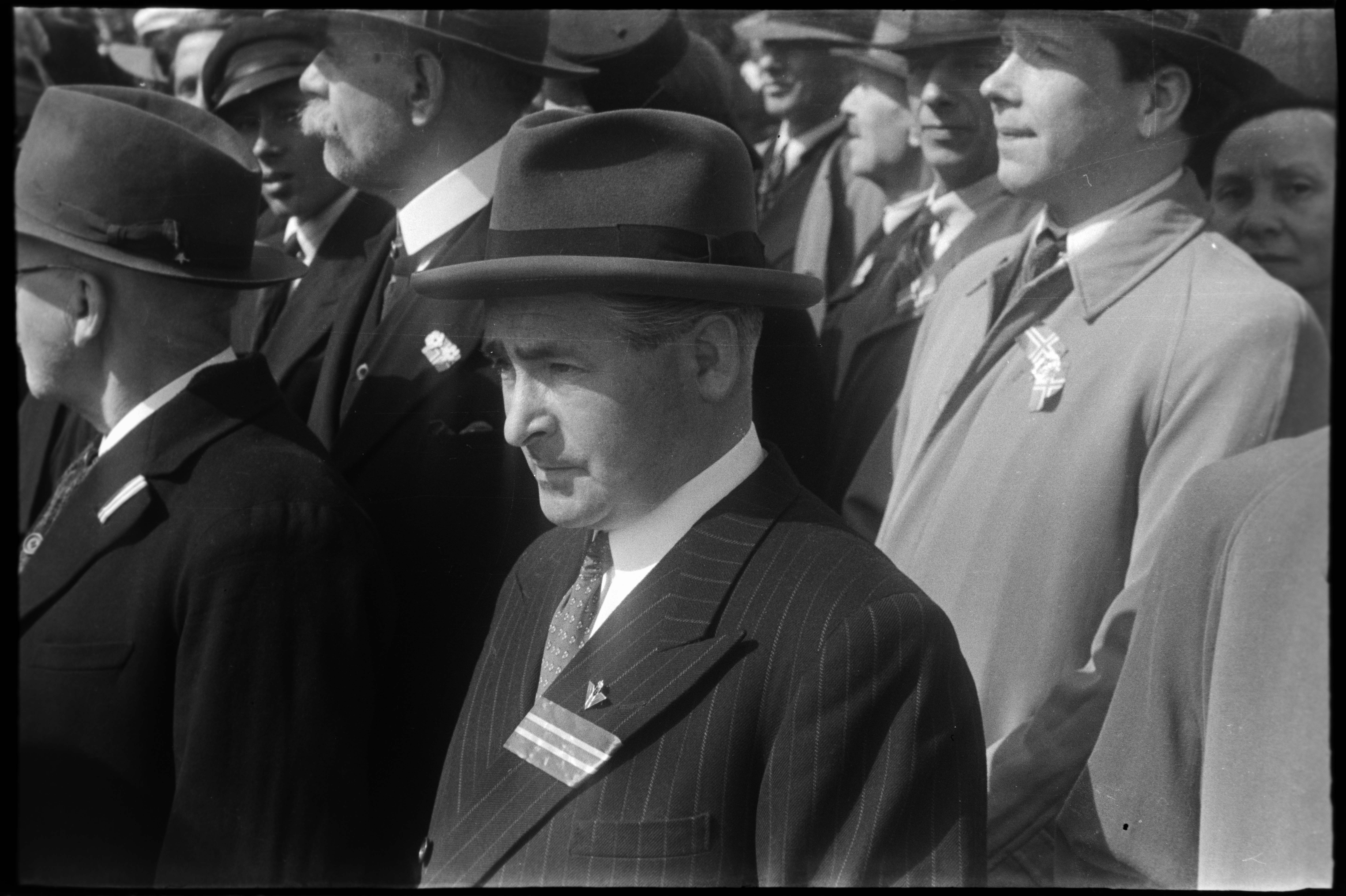 En rekke dresskledte menn utendørs i forbindelse med frigjøringen i mai 1945.