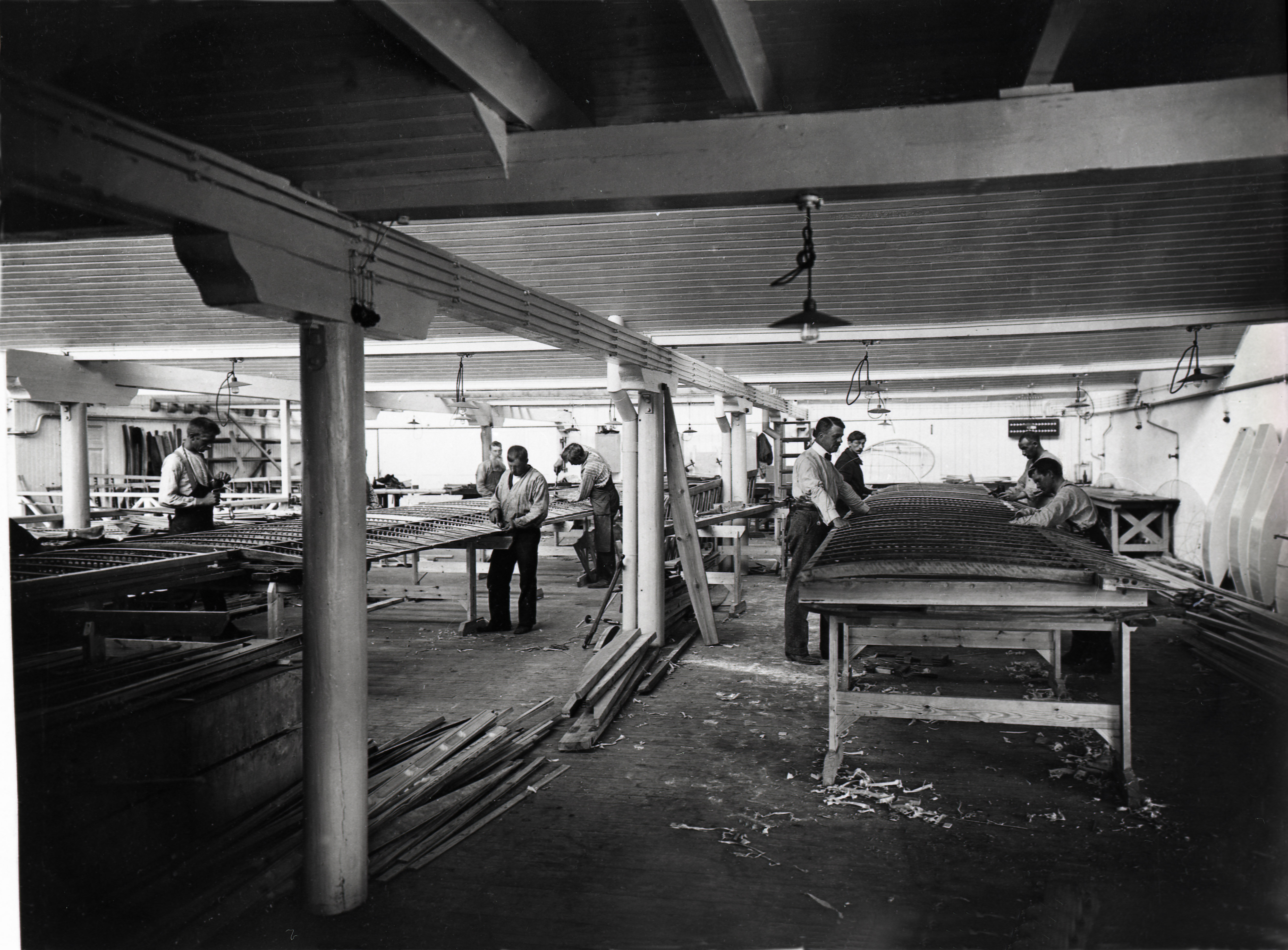 Flyfabrikk. Ett fly, S.W. Farman, dobbeltdekker (biplan), i en monteringshall. Flere fabrikkarbeidere ved flyet.