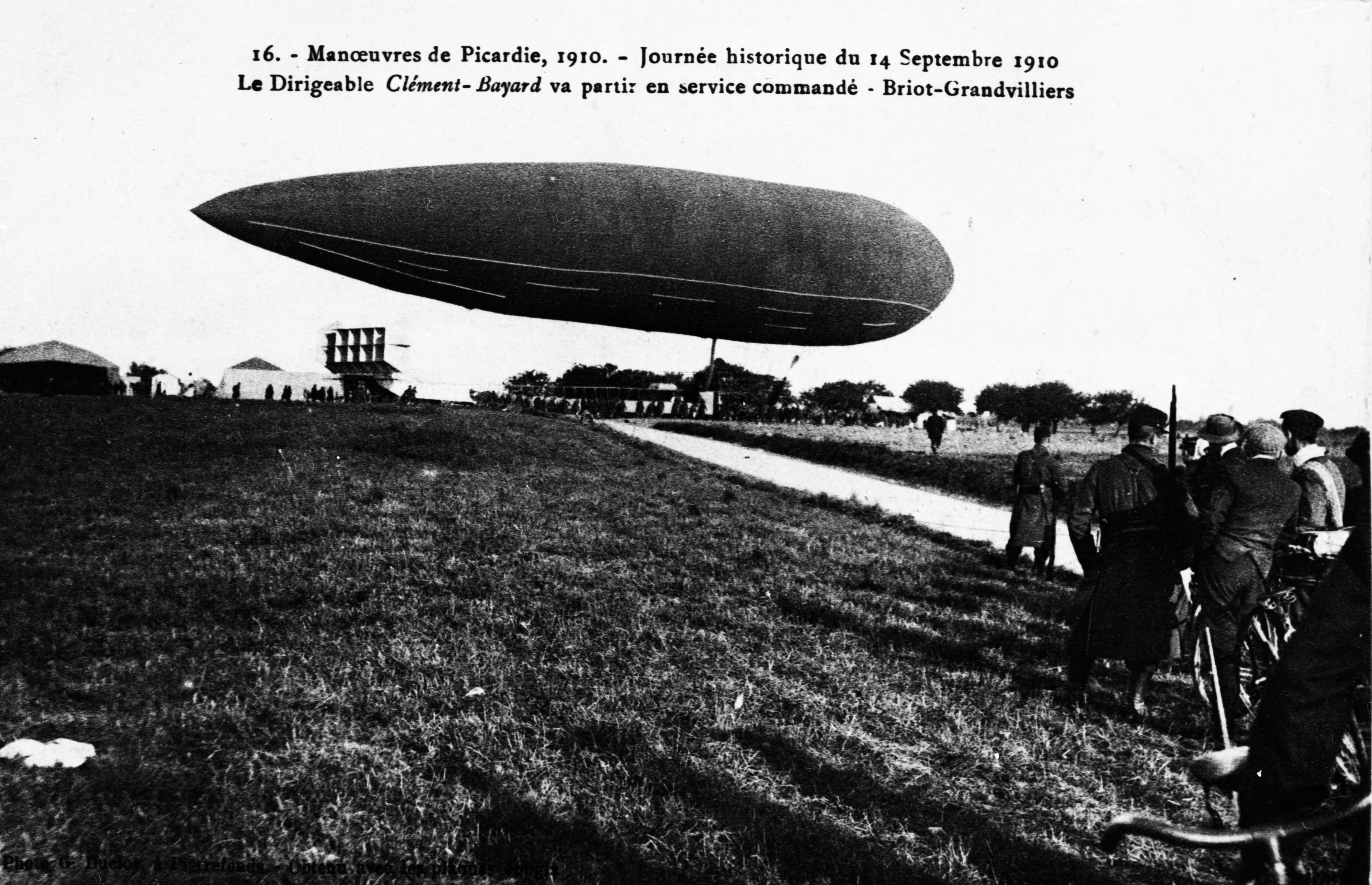 Ett luftskip på bakken, Clèment-Bayard. Noen personer, militære og sivile i forgrunnen