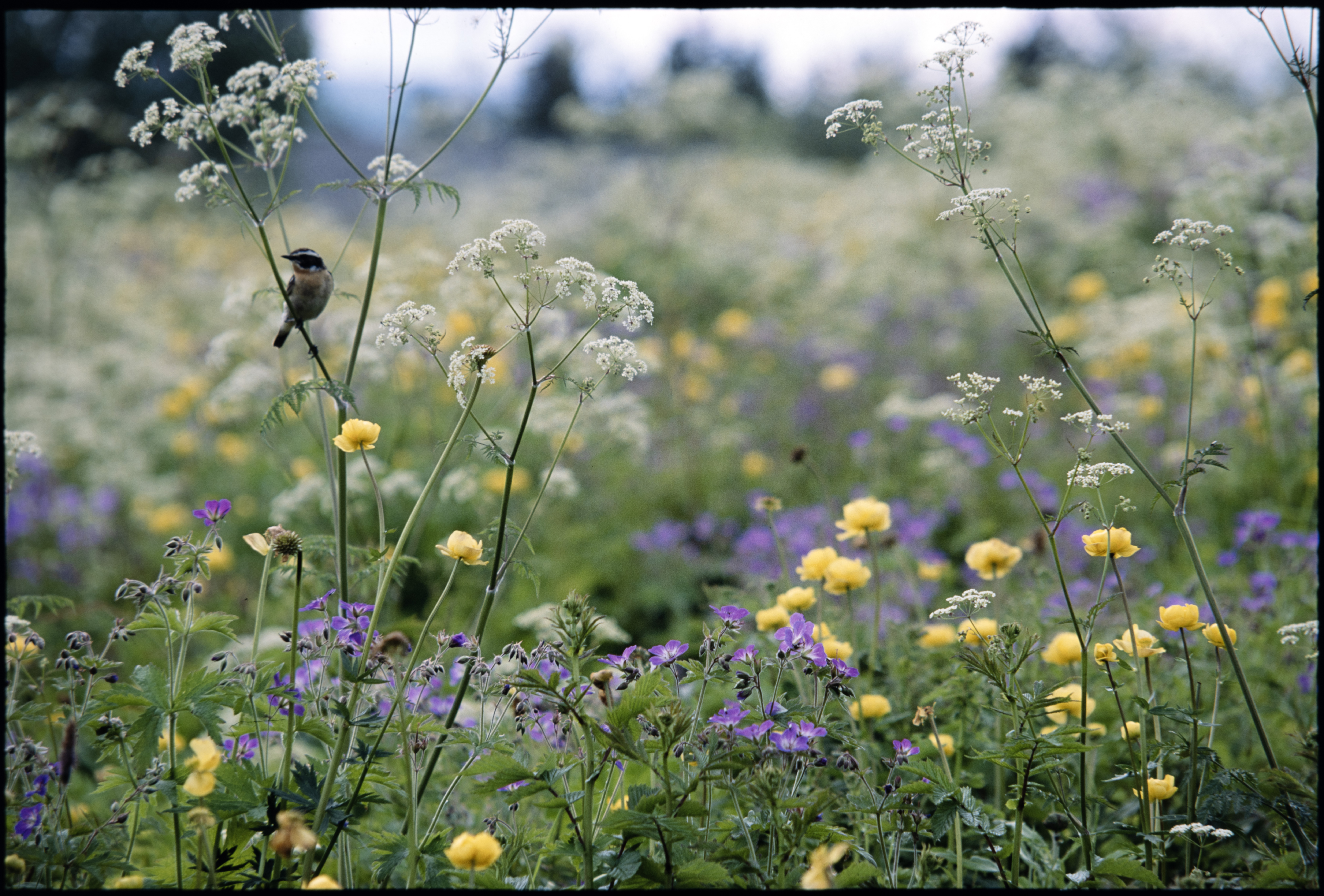 Buskskvett, hann, i blomstereng med hundekjeks, ballblom, skogstorkenebb. Ålen, Holtålen.
