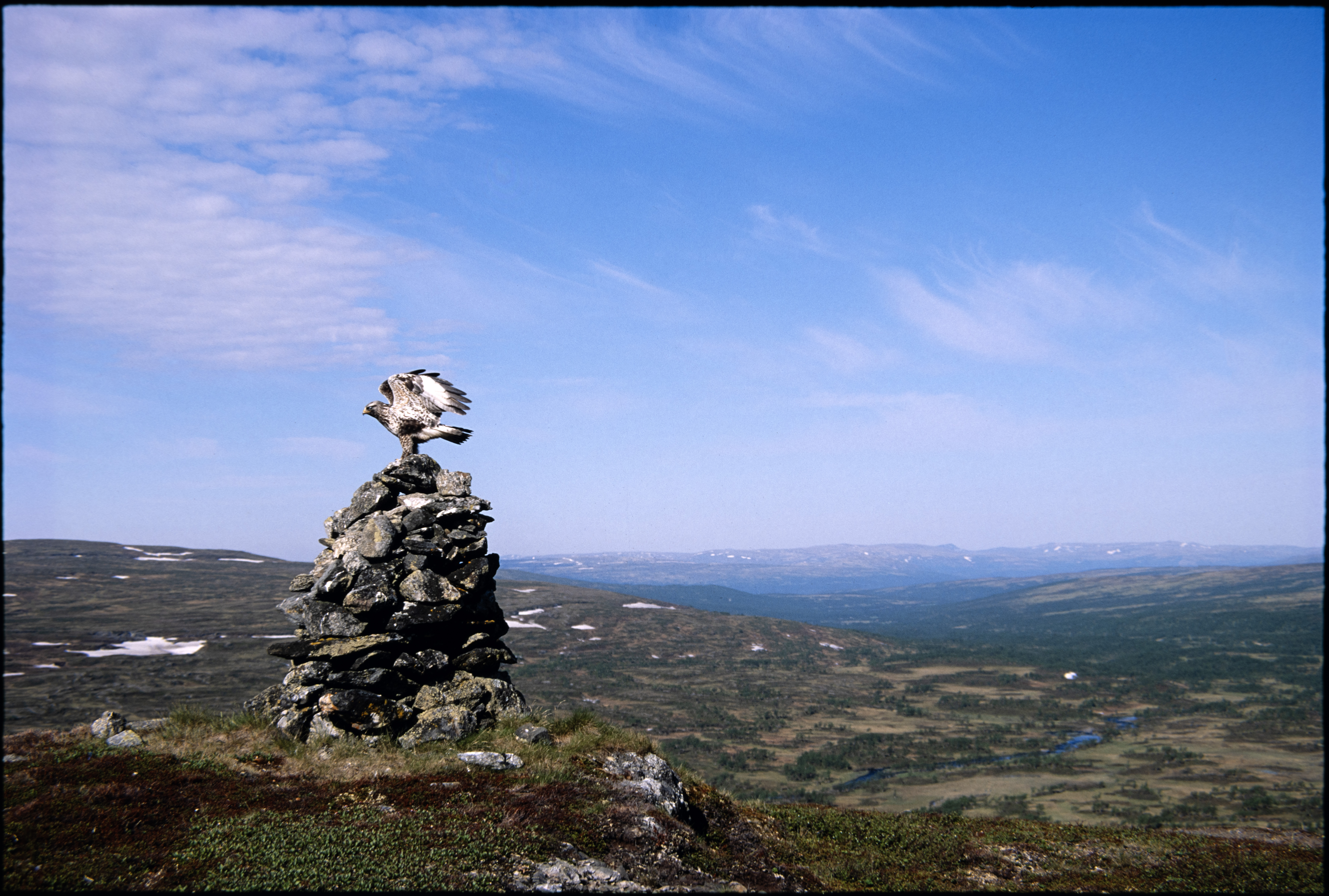 Fjellvåk, på varde, utslåtte vinger, fjellterreng, utsyn over Gauldalen (?)