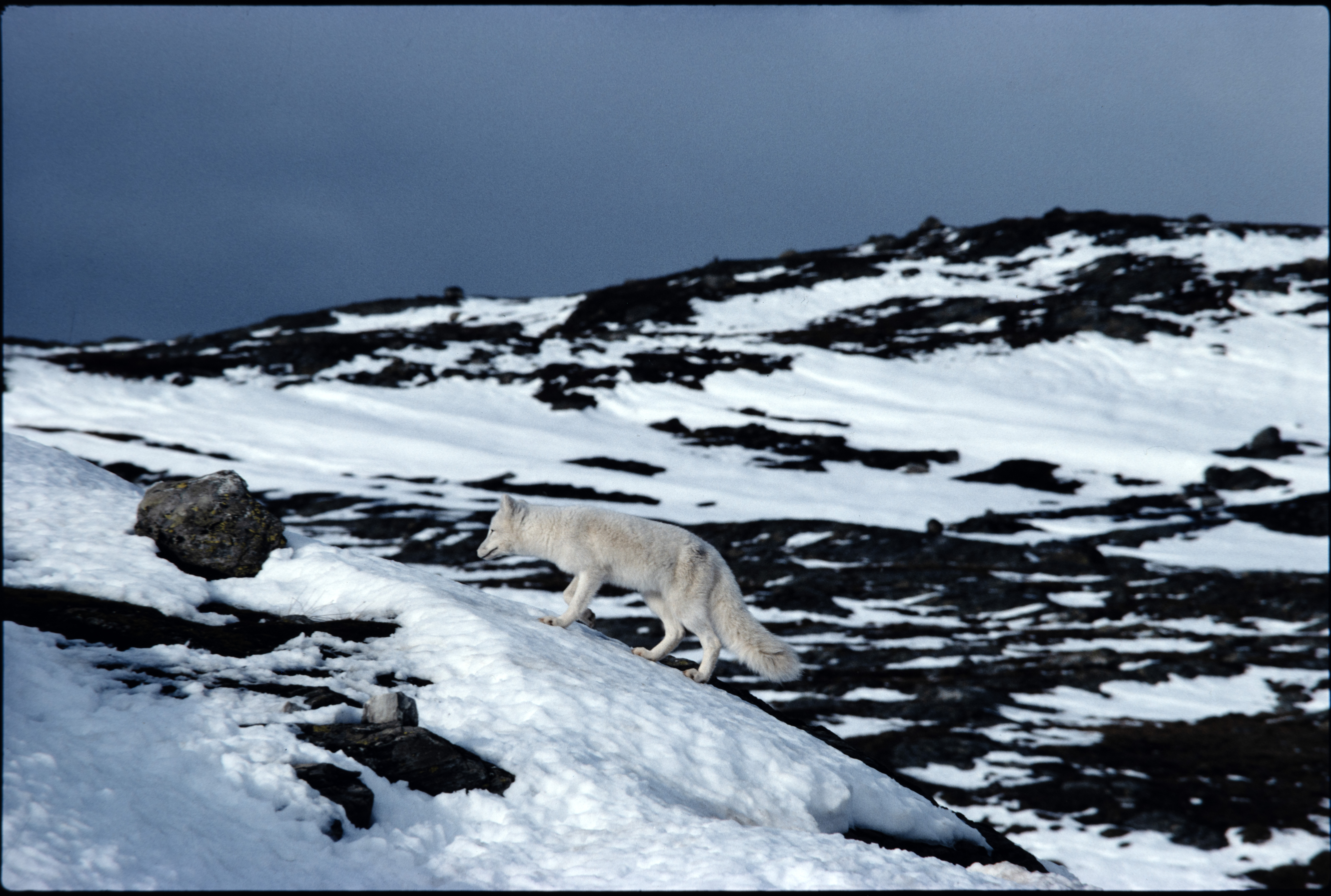 Fjellrev, kvit rev, snø. Kjølifjellet, Holtålen. Oktober ca.1982