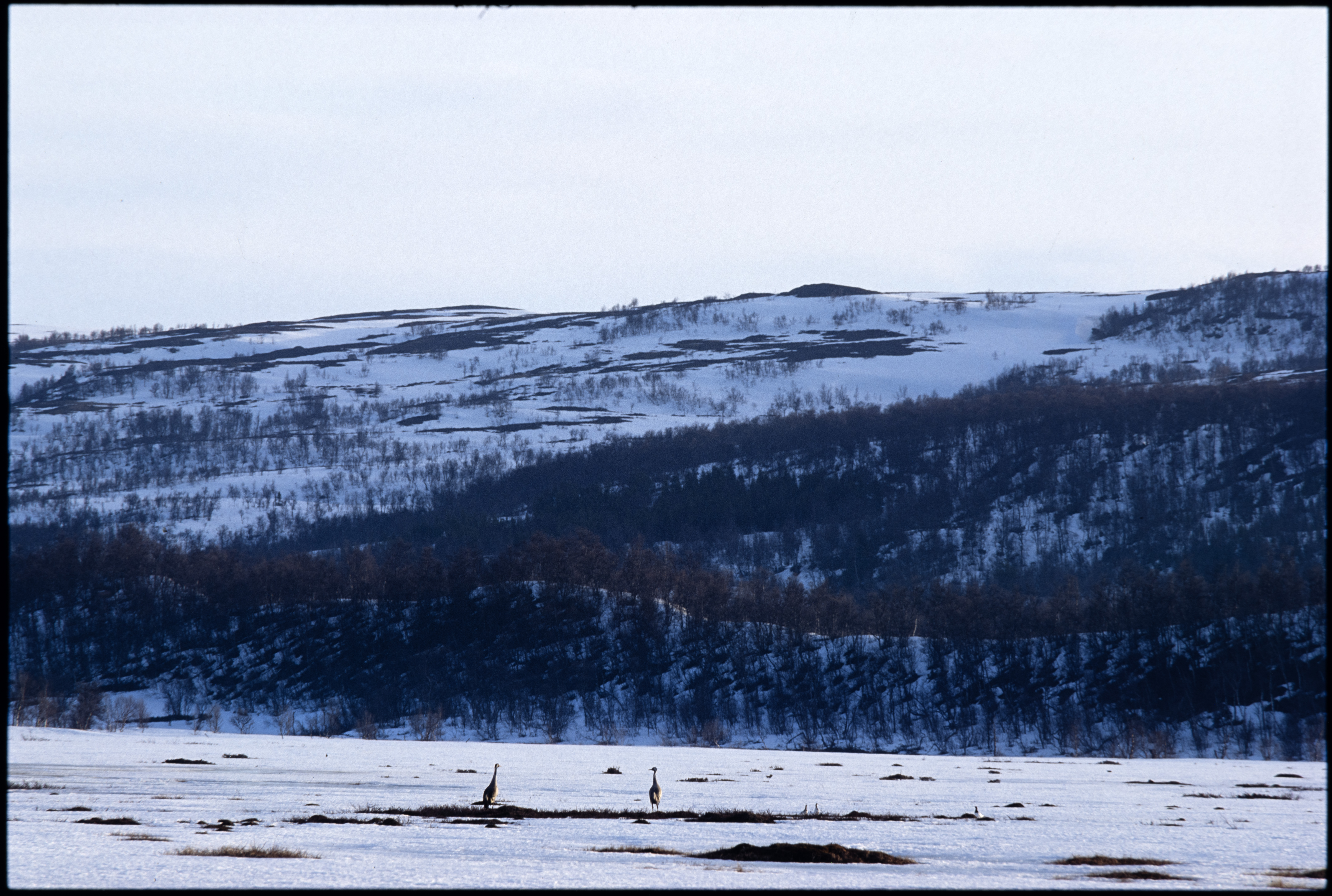 Traner. Ryper. På fjellmyr under snødekte fjell. Vår