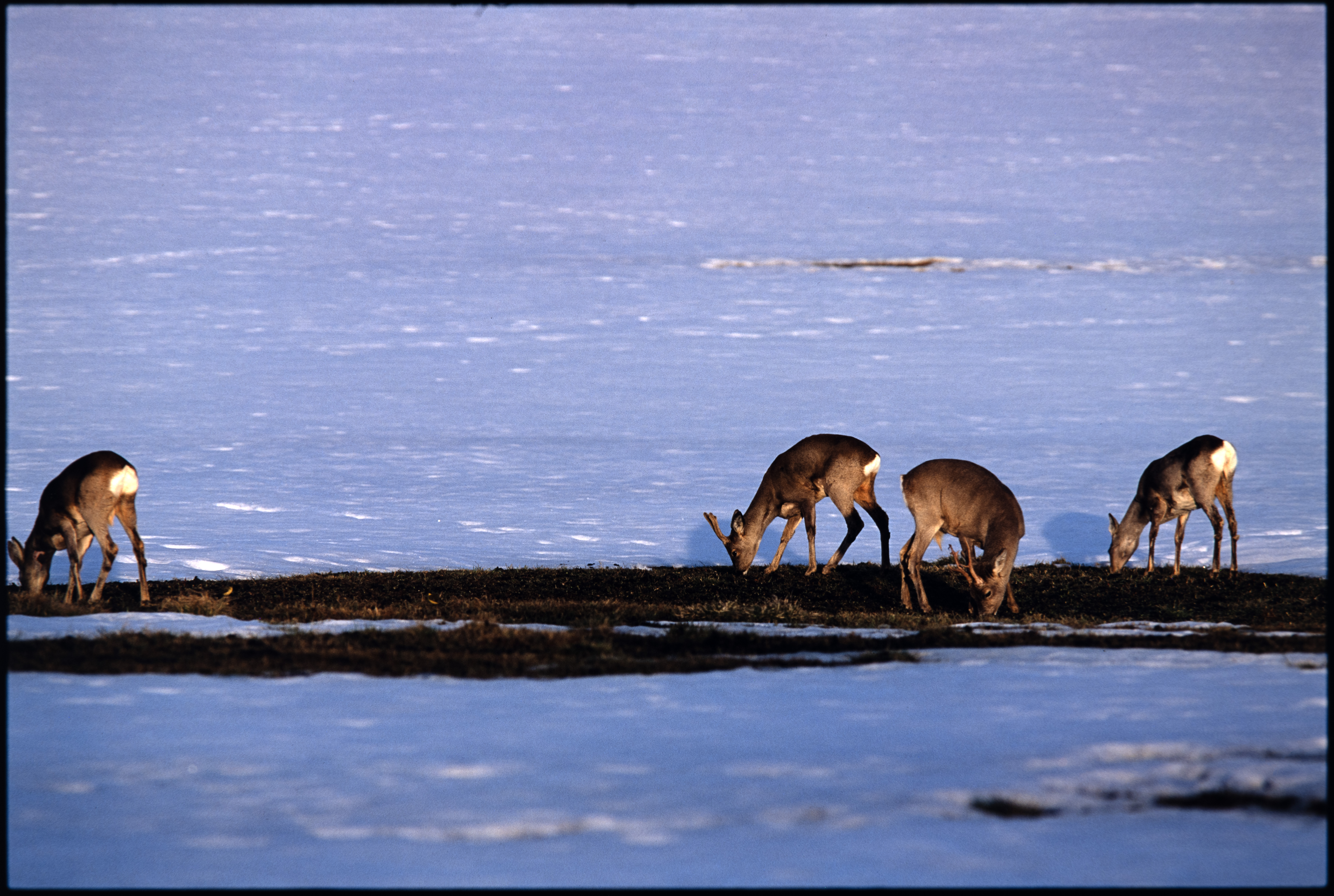 Rådyr. Fire dyr beiter på groen. Vår