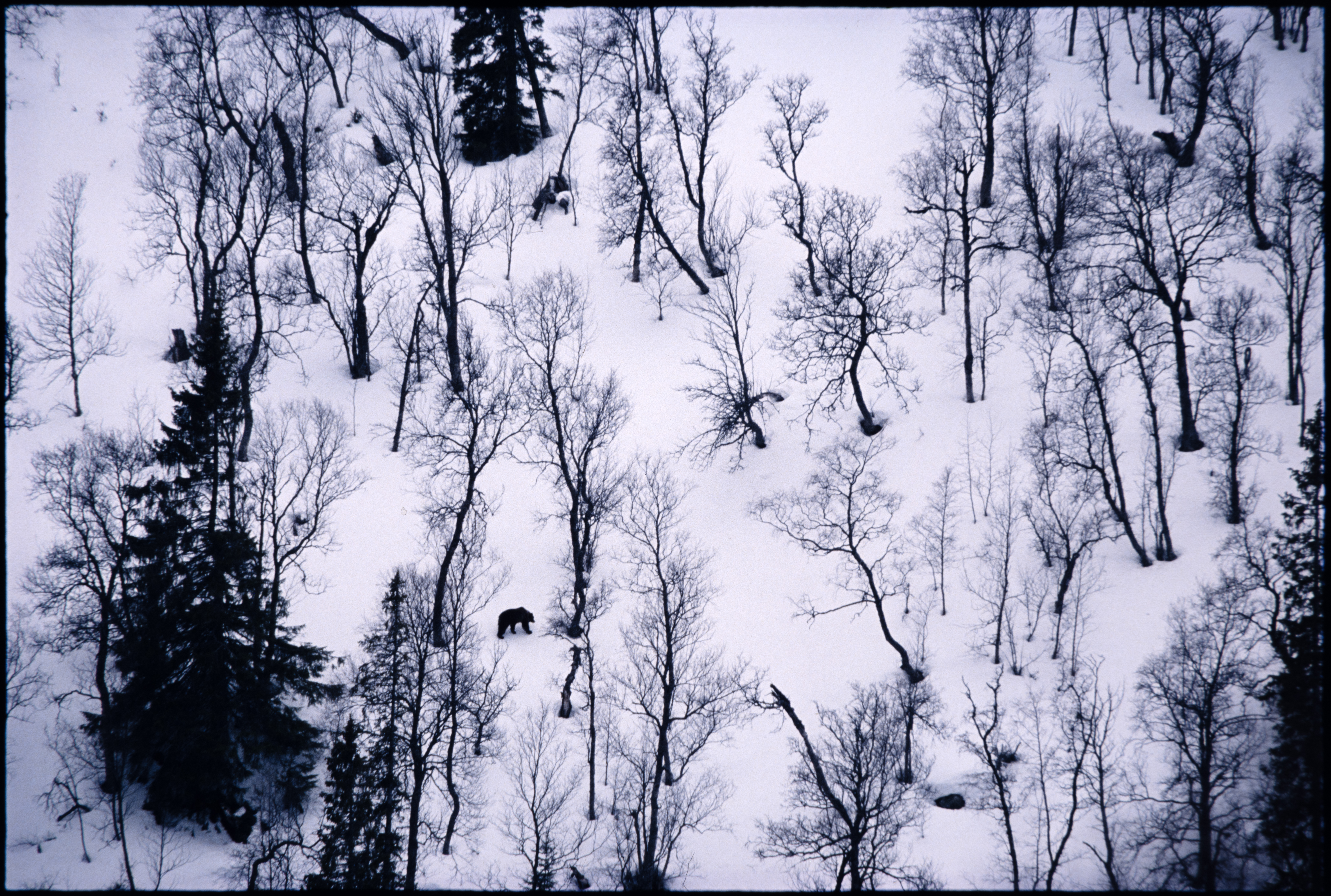 Brunbjørn. Nyss ut av hi i Øggdalen. Holtålen. Tidlig vår. 1990-tallet?