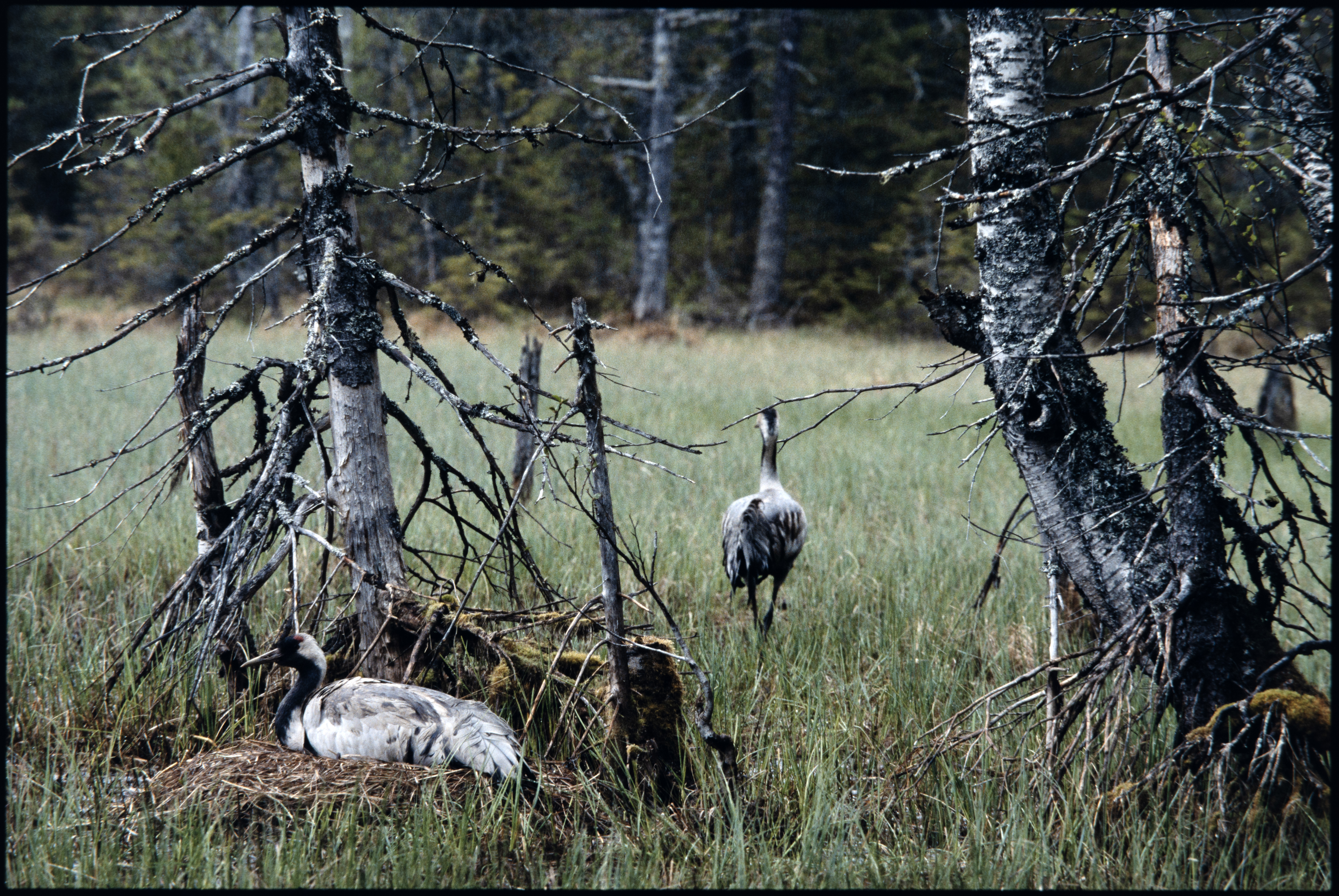 Trane. En fugl på reir, en står i myr. Sommer