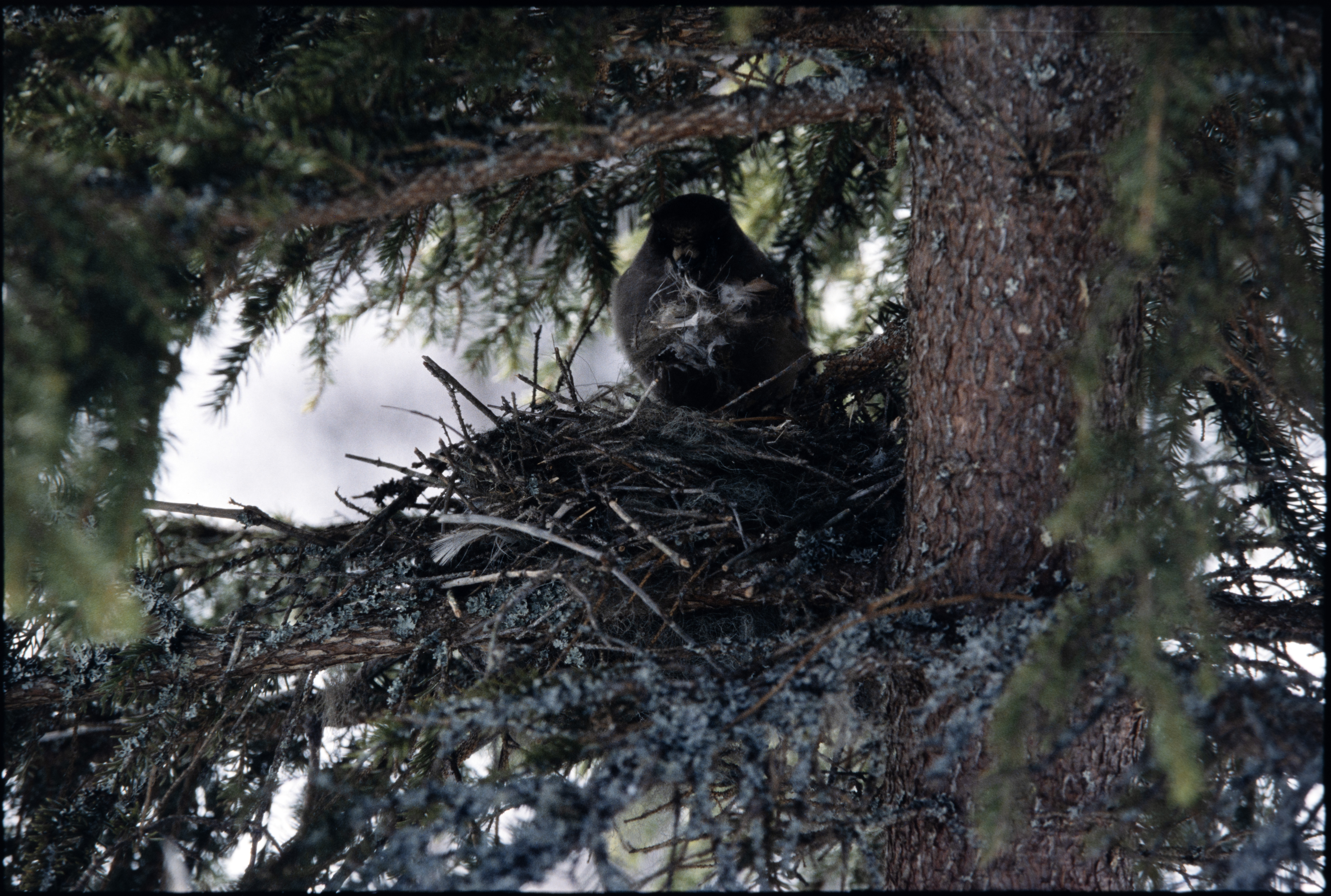 Lavskrike. Reirbygging i gran. Vår