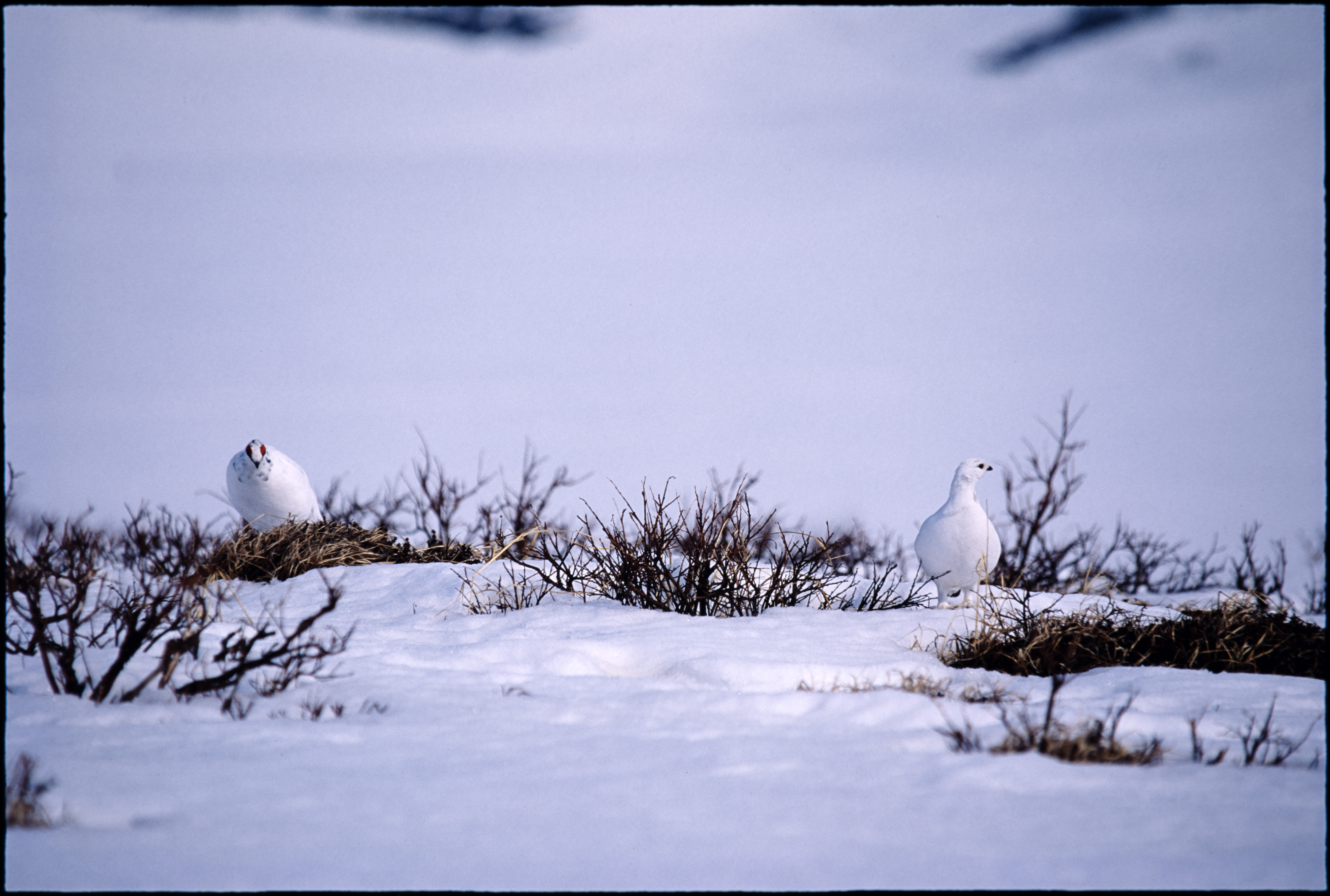 Fjellrype. Stegg og hunn beiter på småkratt i snøen