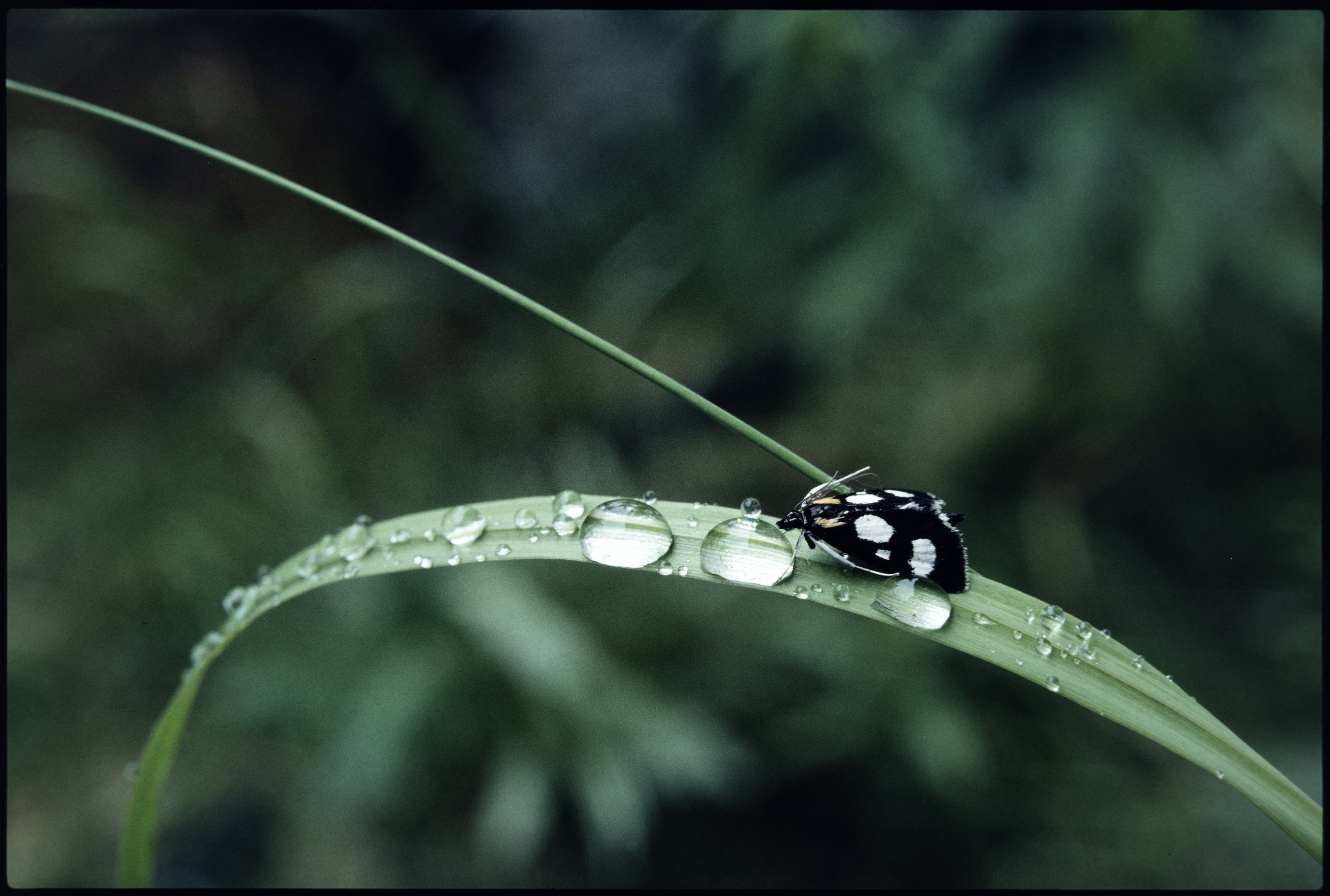 Sommerfugl. På grasblad med regndråper