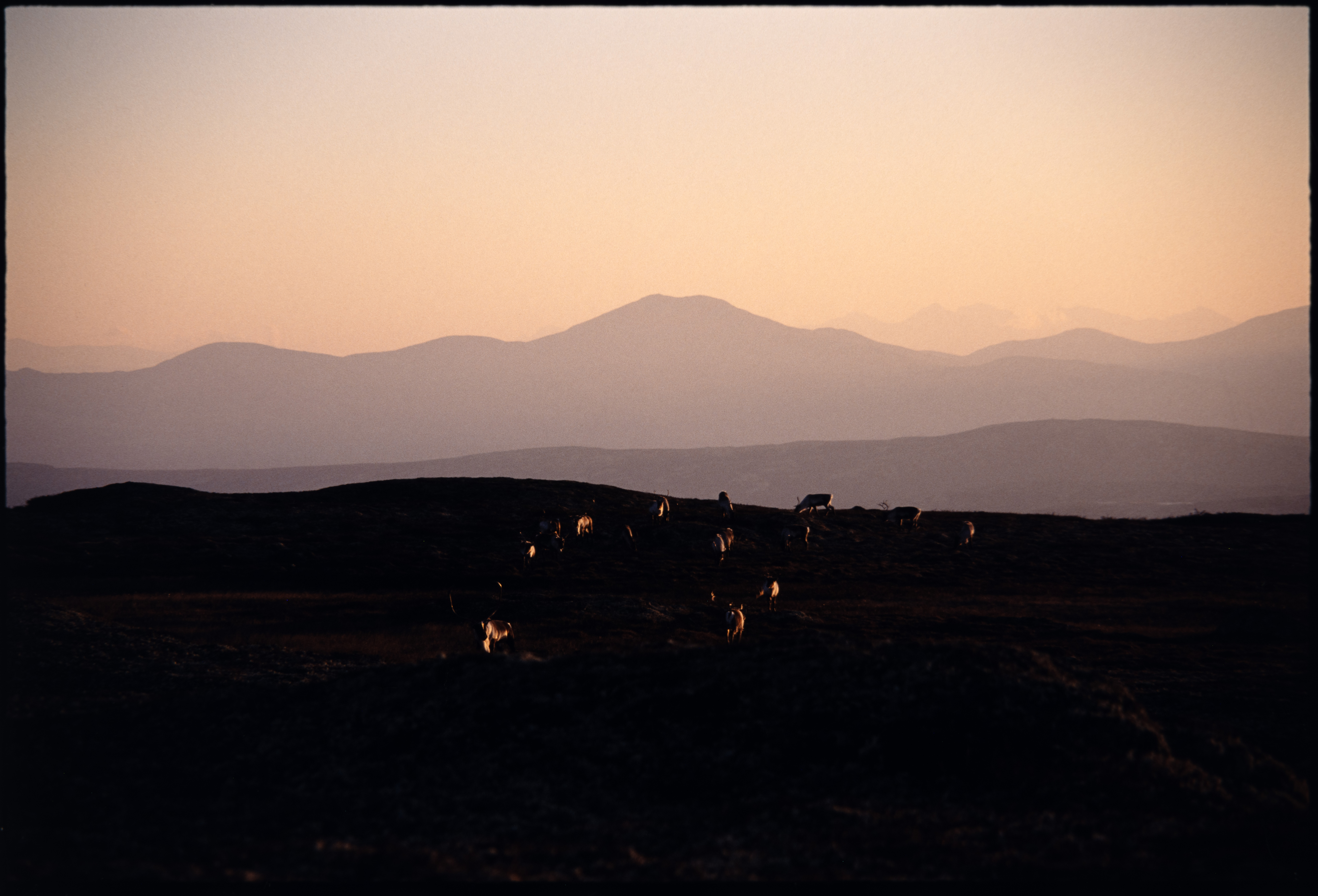 Villrein. Liten flokk i kveldslys. Fjell i bakgrunnen