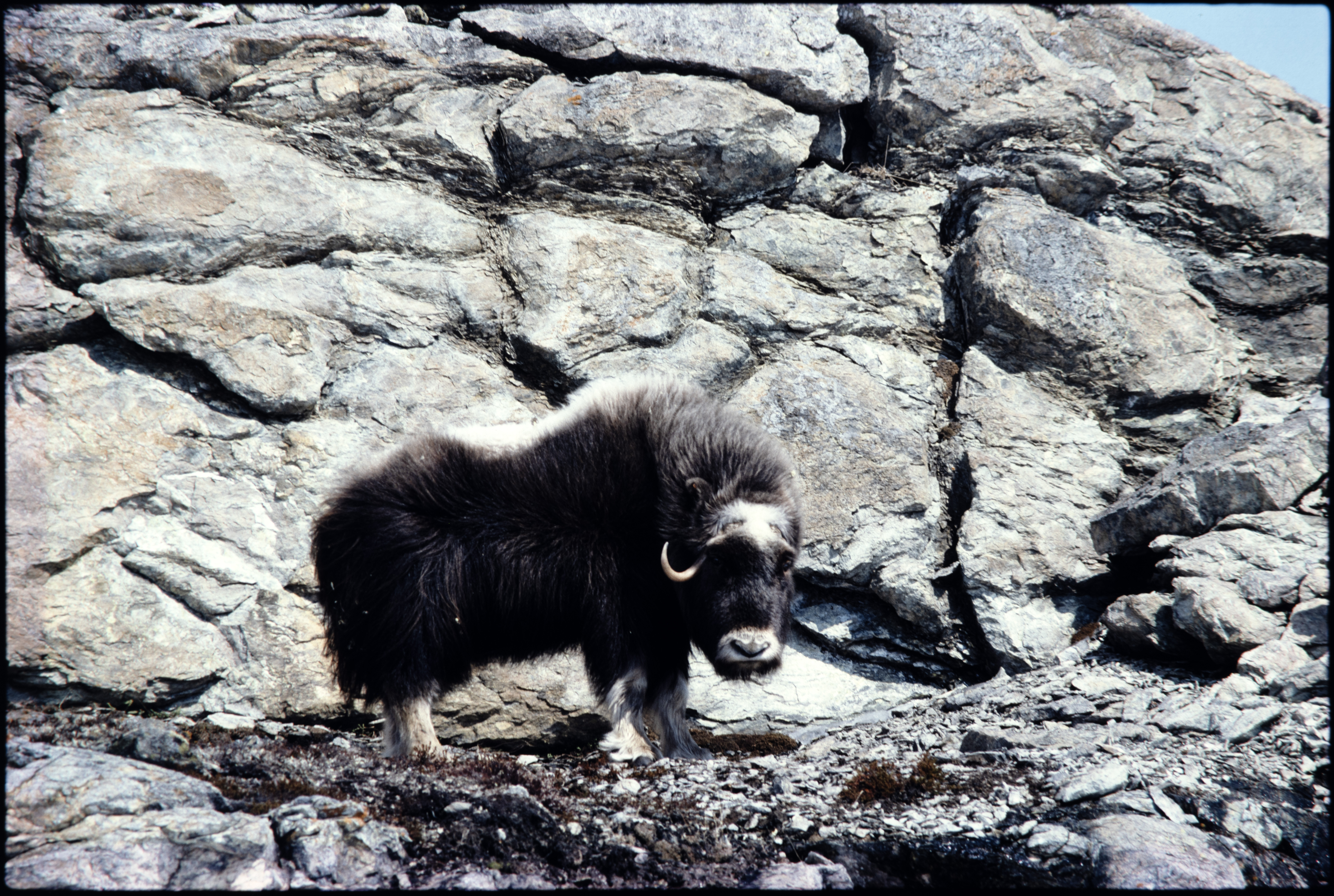 Moskusfe. Dyr med ett horn. På berghylle.