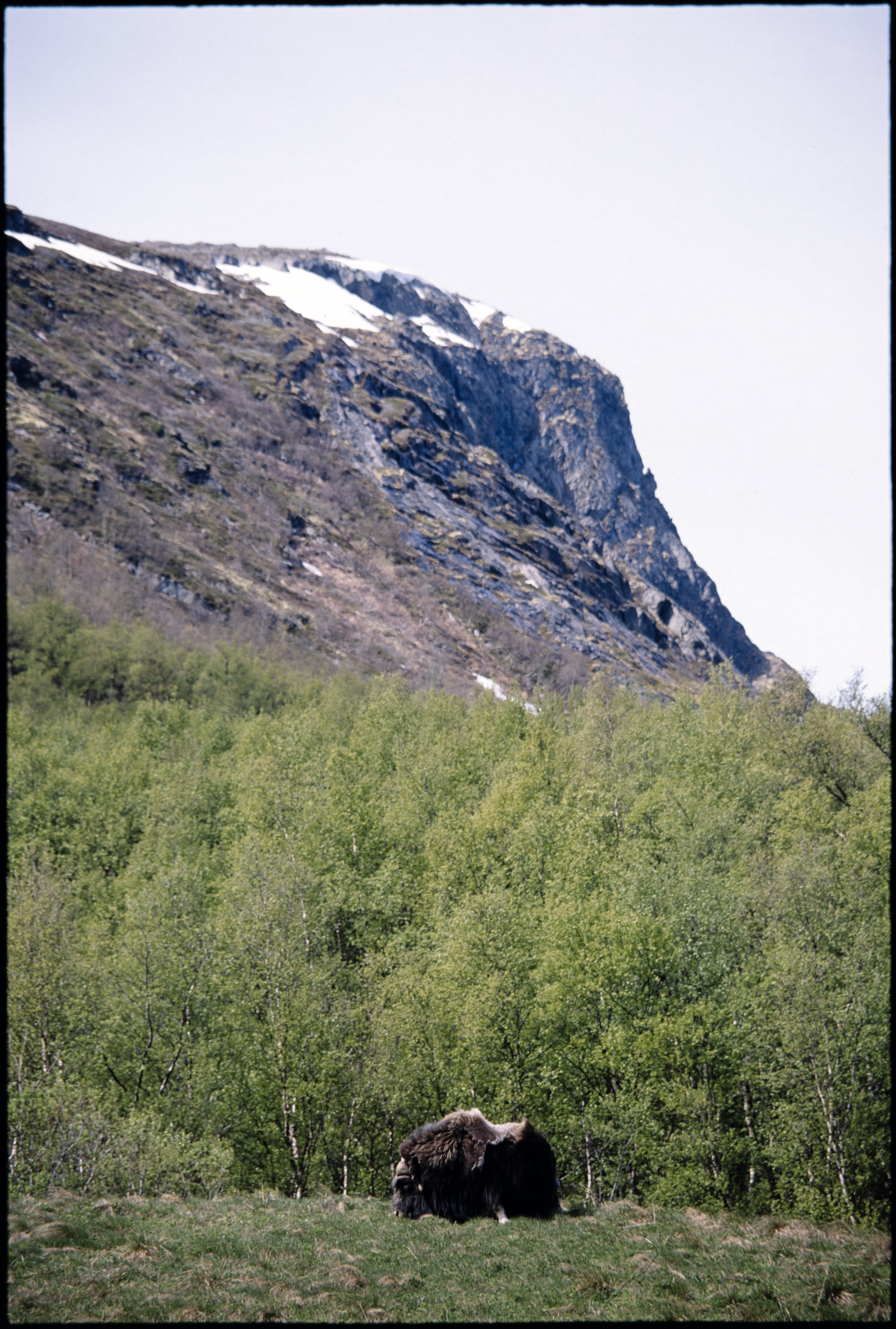 Moskusfe. 1 individ beiter i fjellbjørkskog med bergskrent