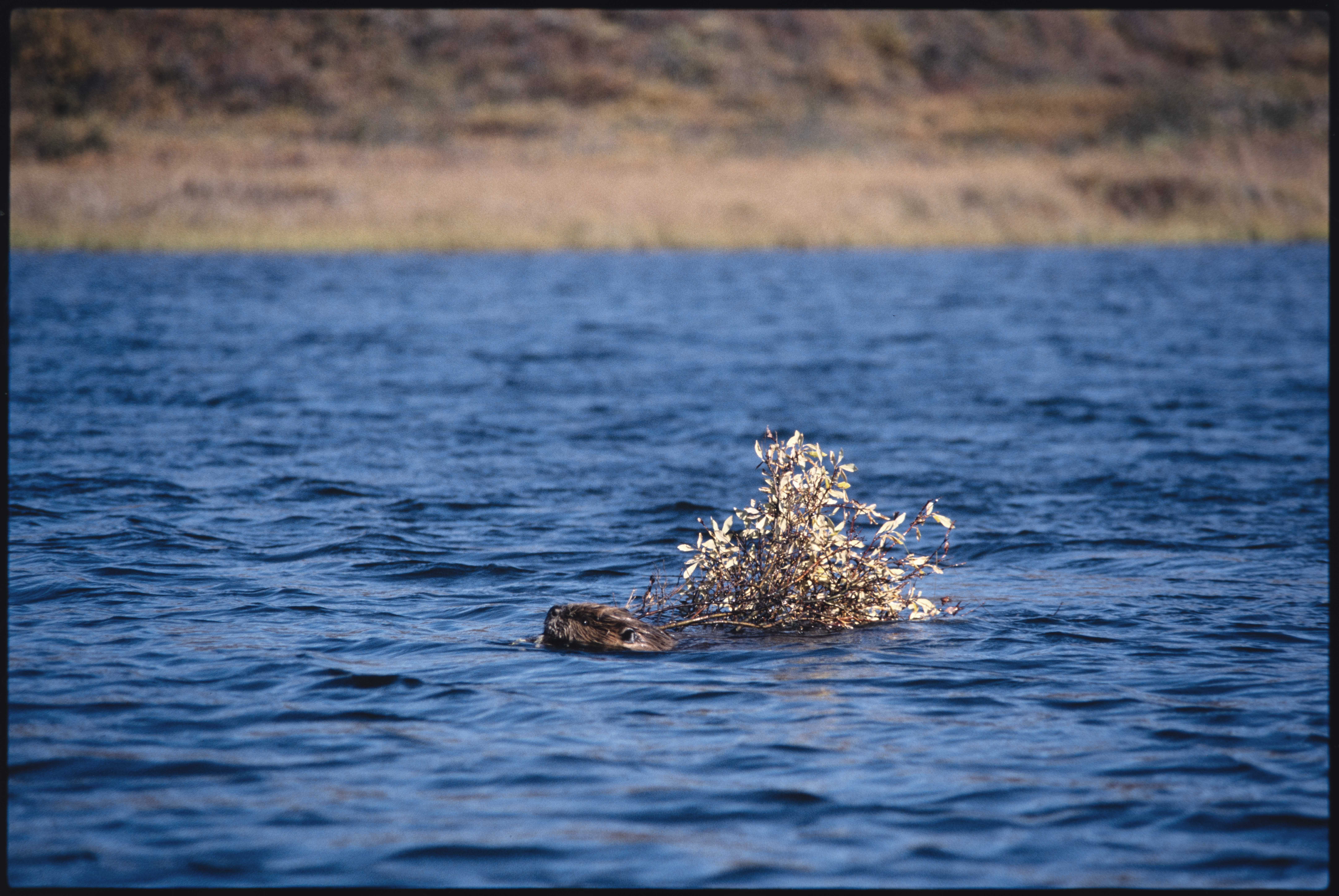 Bever. Svømmer med vierkvist i kjeften