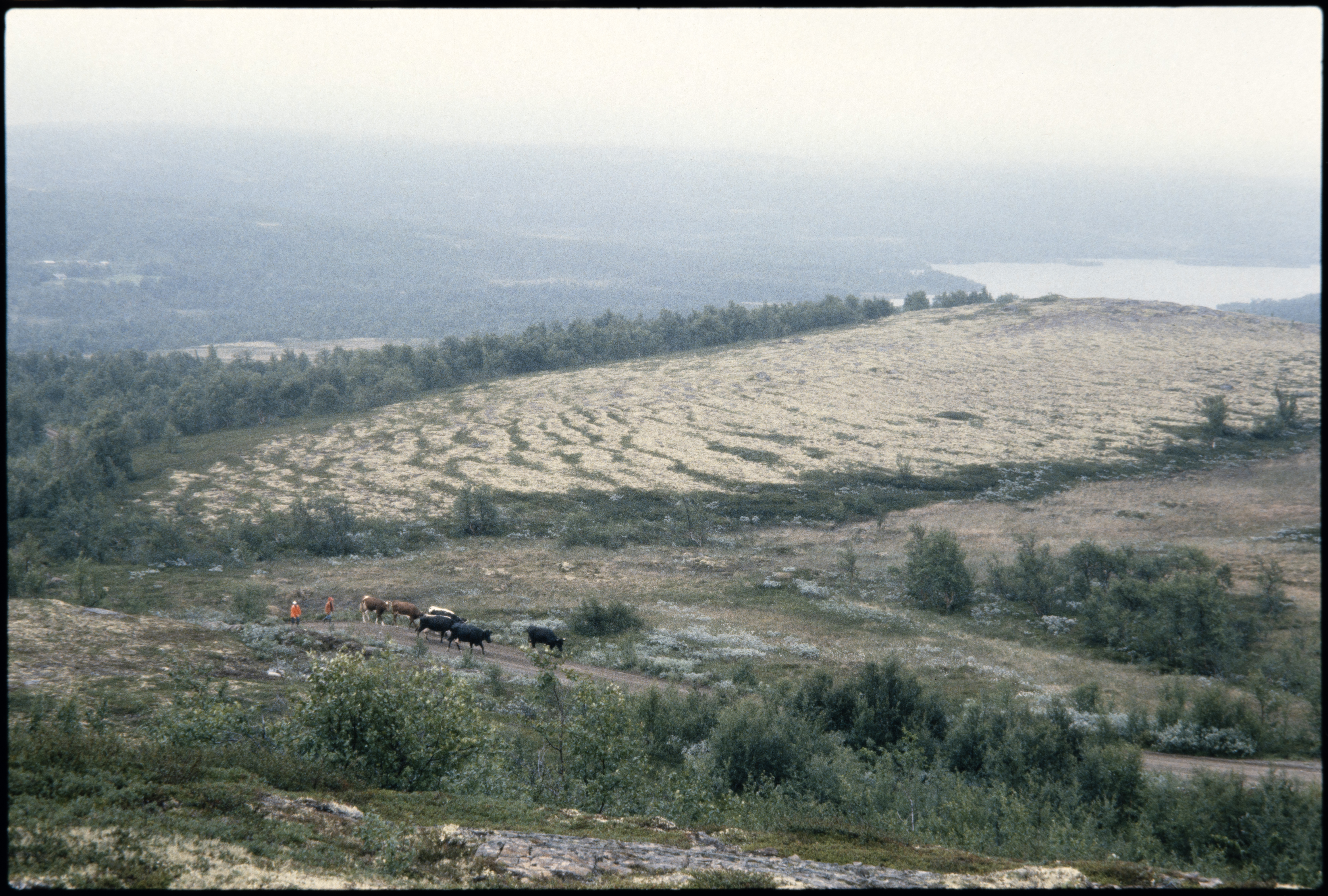 Storfe. Gutter fører en kuflokk med 6 dyr til seters i gråvær. Opp mot Slettælet. Øyungsvegen. Holtålen