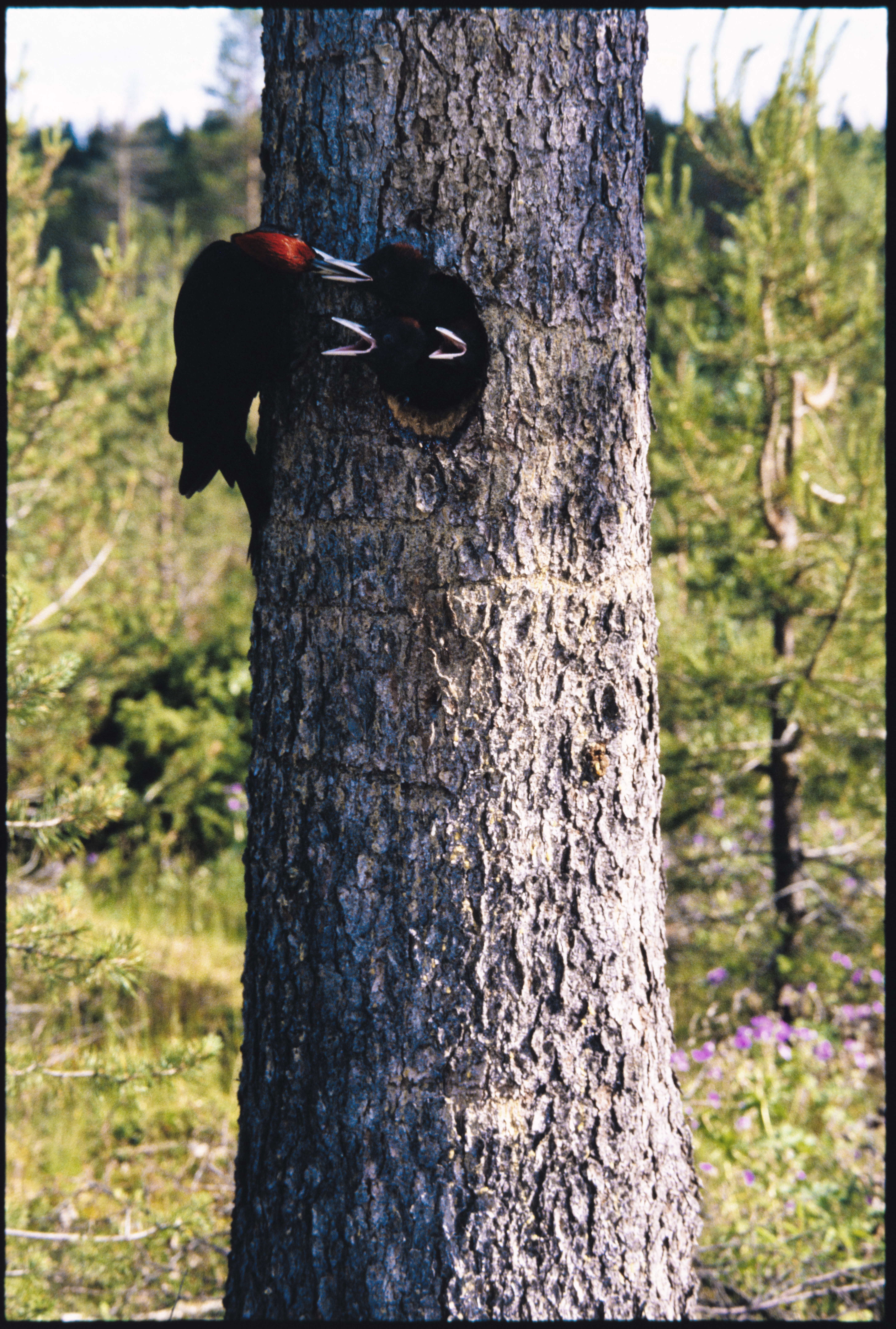 Svartspett. Hann mater 3 unger i reirhull på gran. Ringer på stammen etter tretåspett på kvae-søk