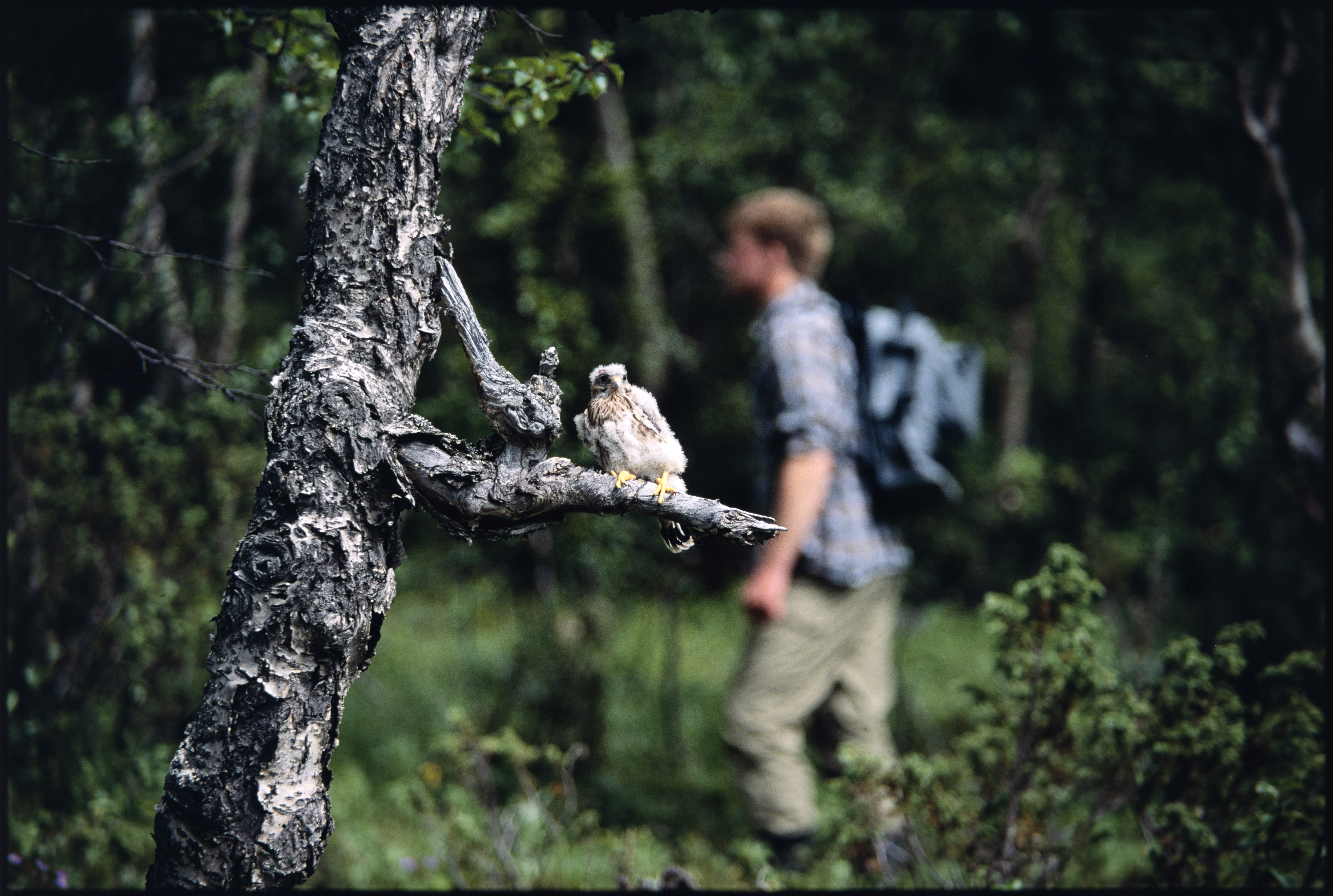 Tårnfalk. Unge på død bjørkegrein. I dunfelling. Mann i bakgrunnen