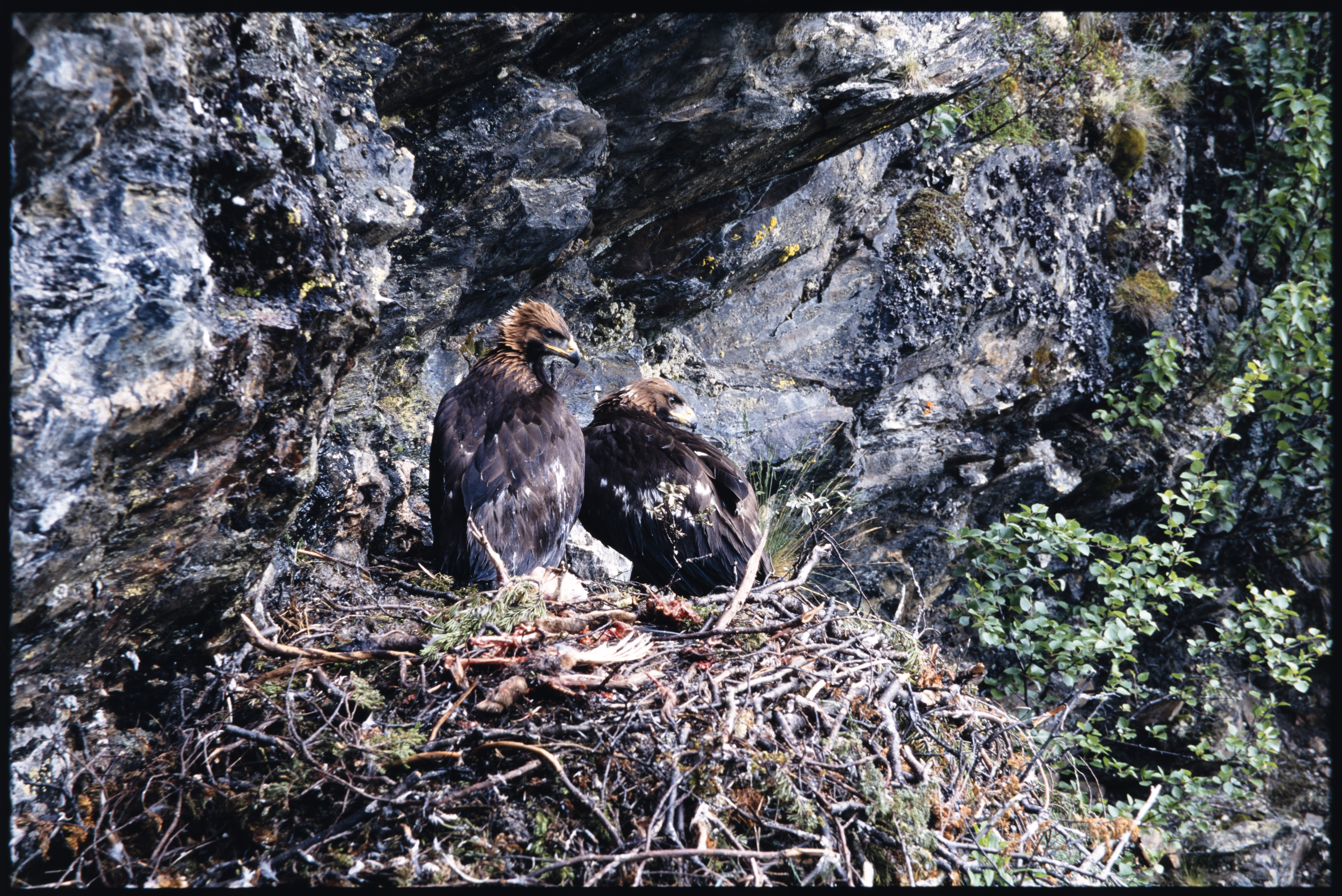 Kongeørn. 2 snart flygeklare ungfugl på reir