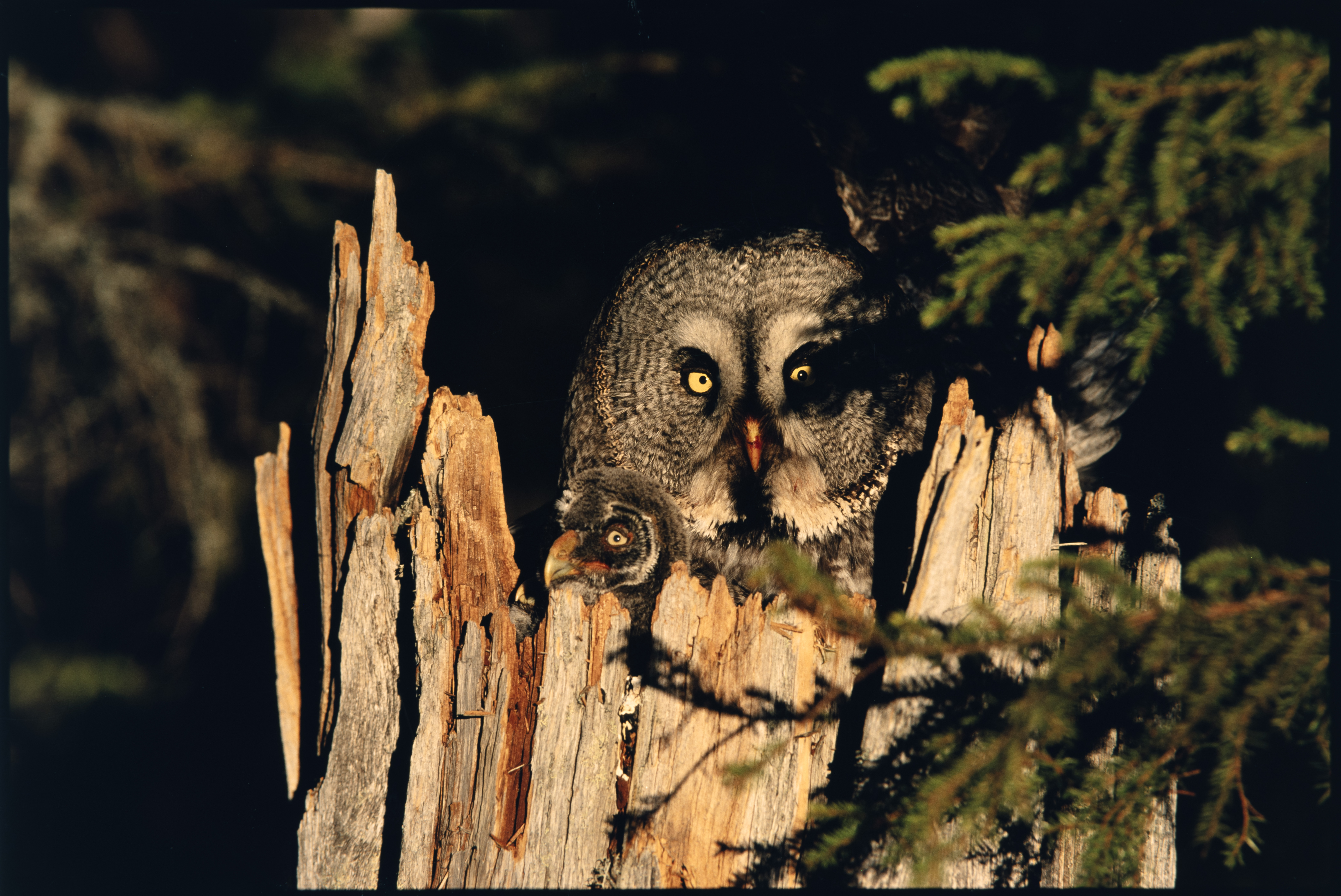 Lappugle. Voksen og unge. På reir i stubbe