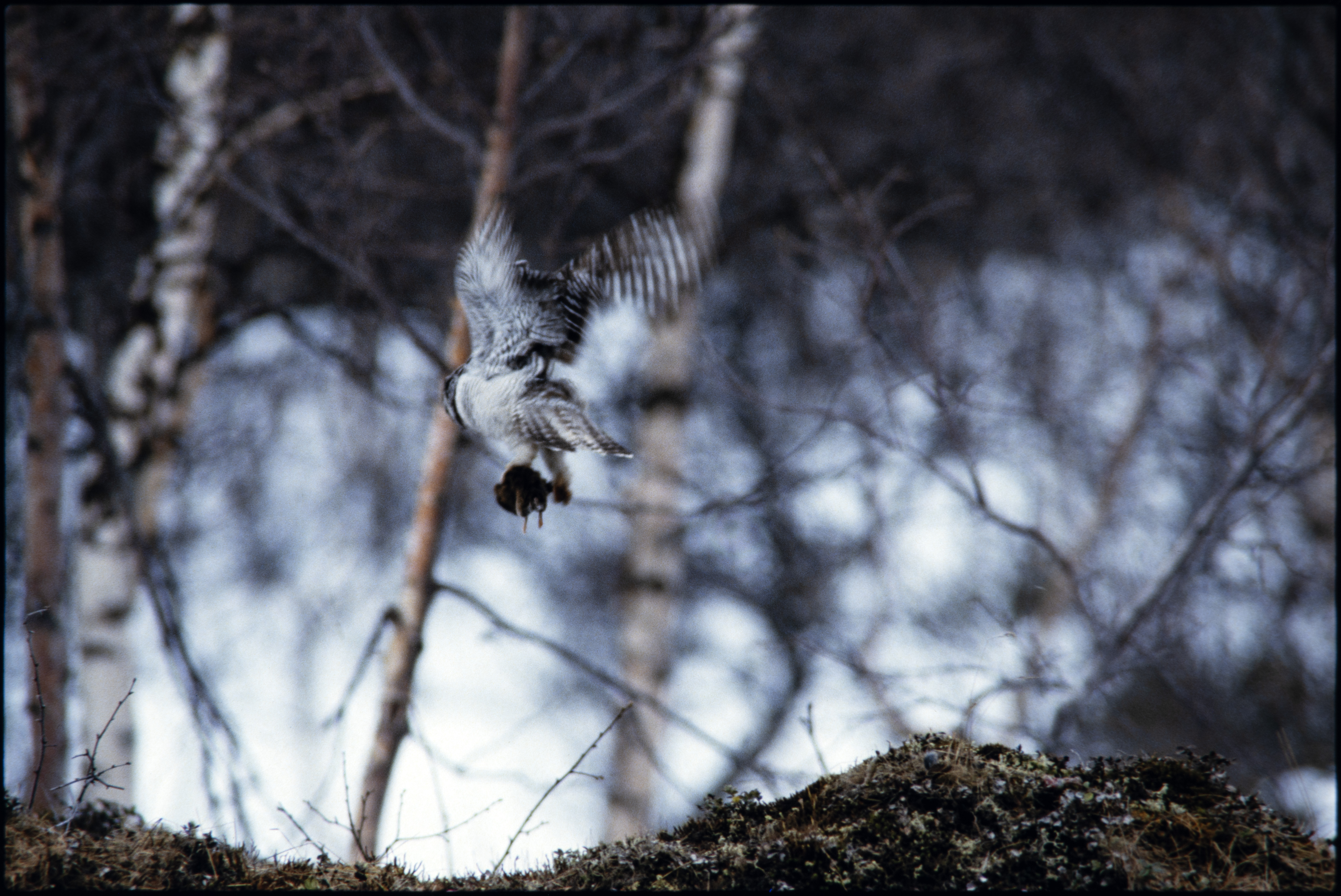 Haukugle. I flukt med bytte, mus