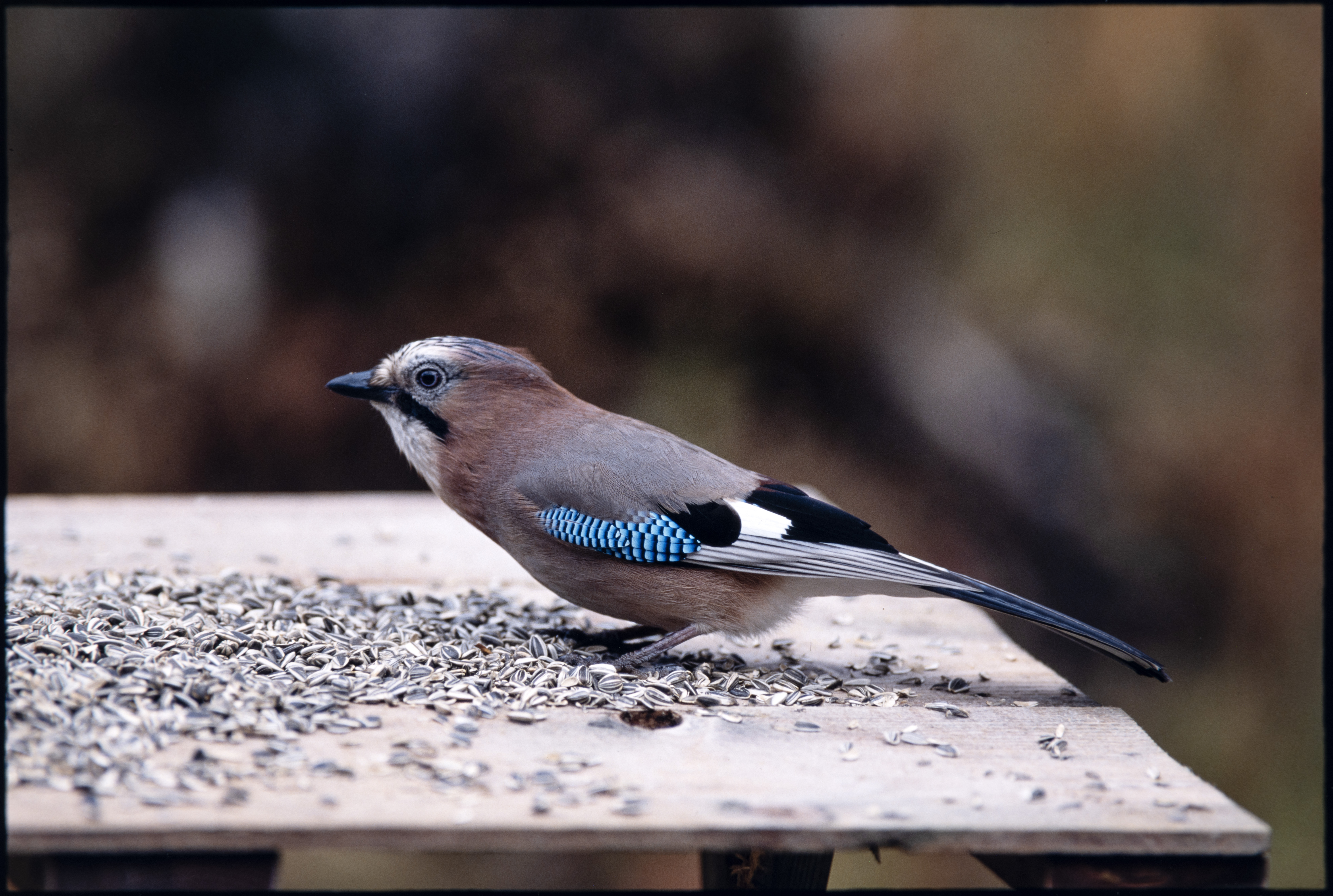 Nøtteskrike. På fuglebrett med solsikkefrø