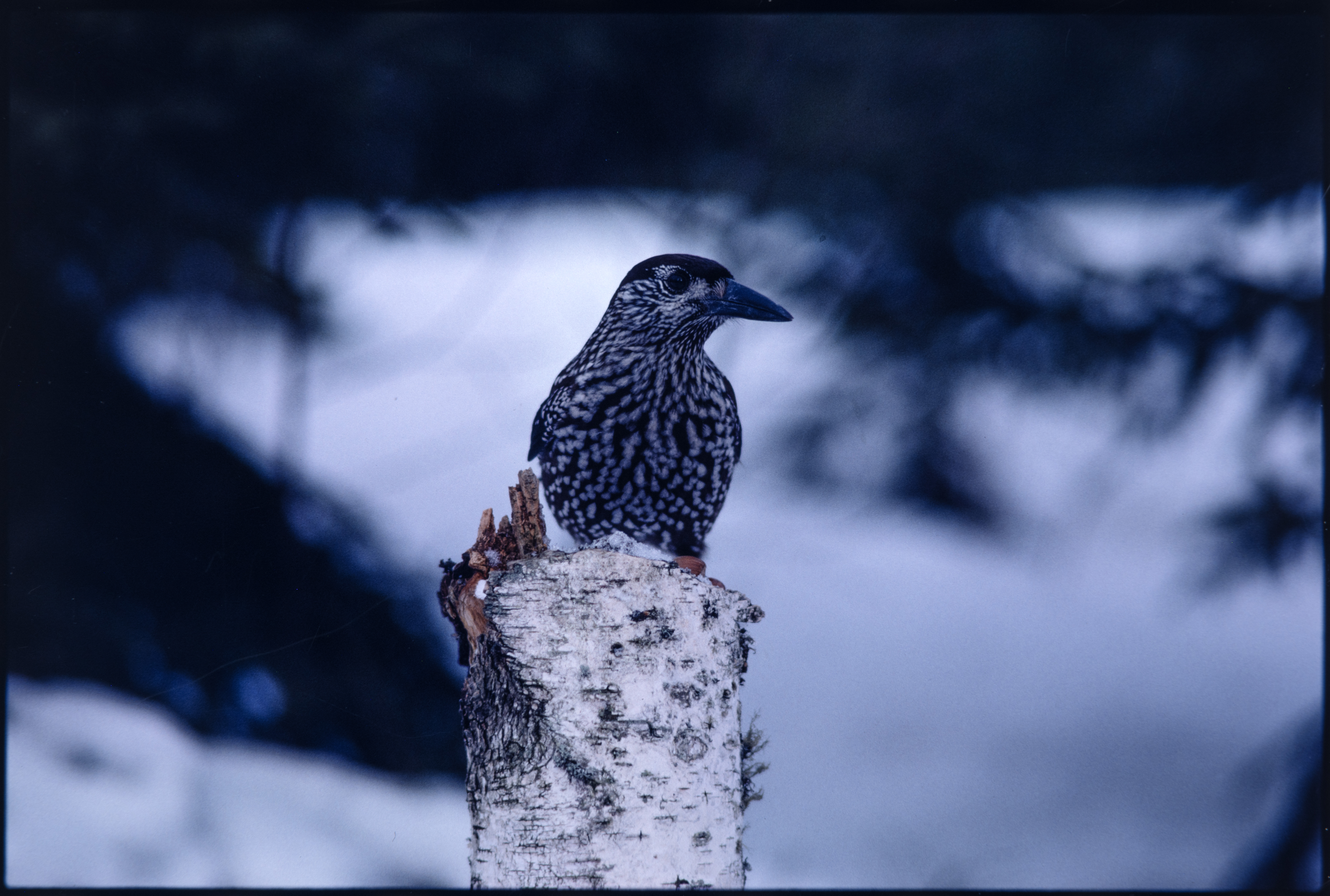 Sibirnøttekråke. Med hasselnøtt i nebbet. Ved foten av bjørkestubbe