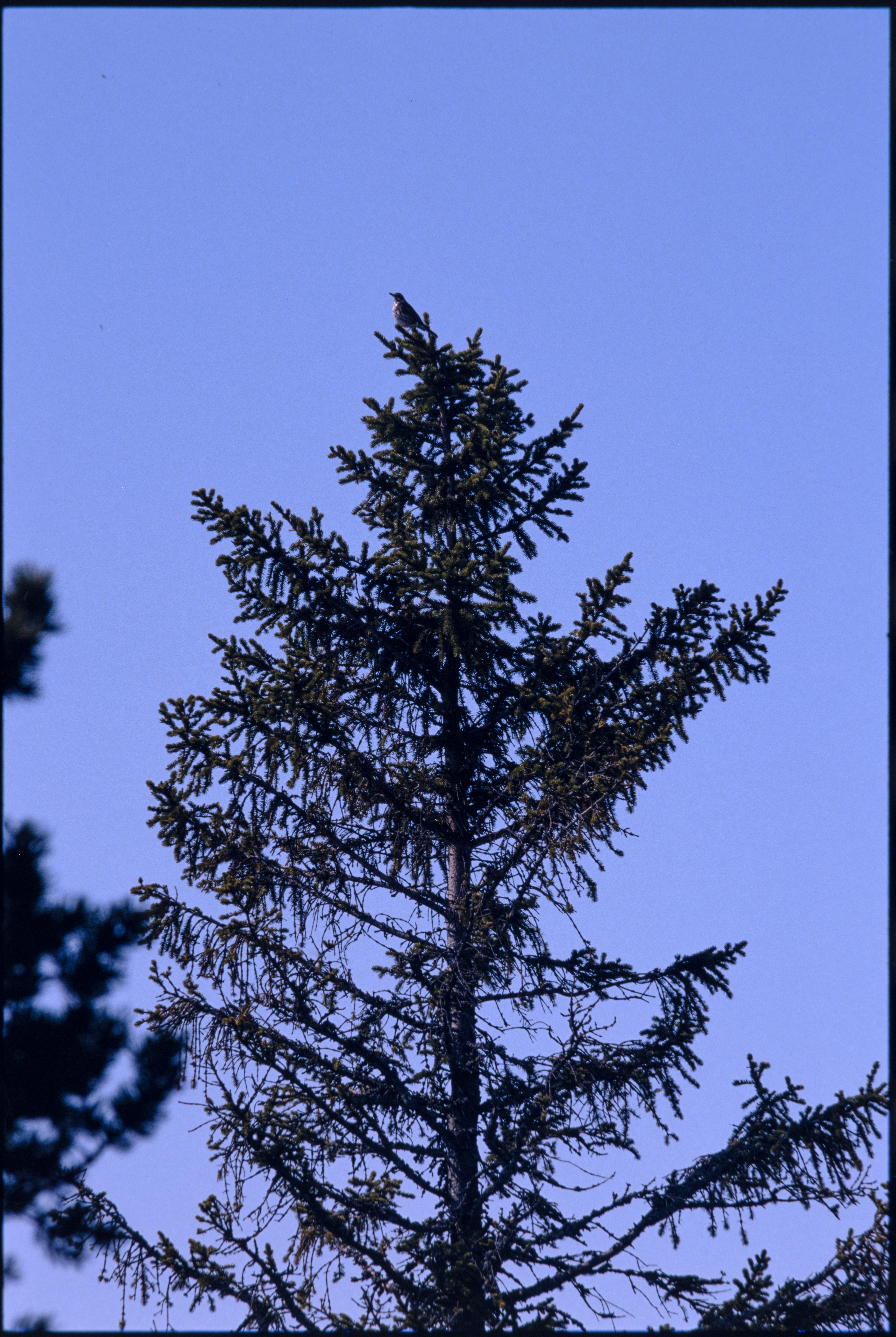 Rødvingetrost. Synger i grantopp
