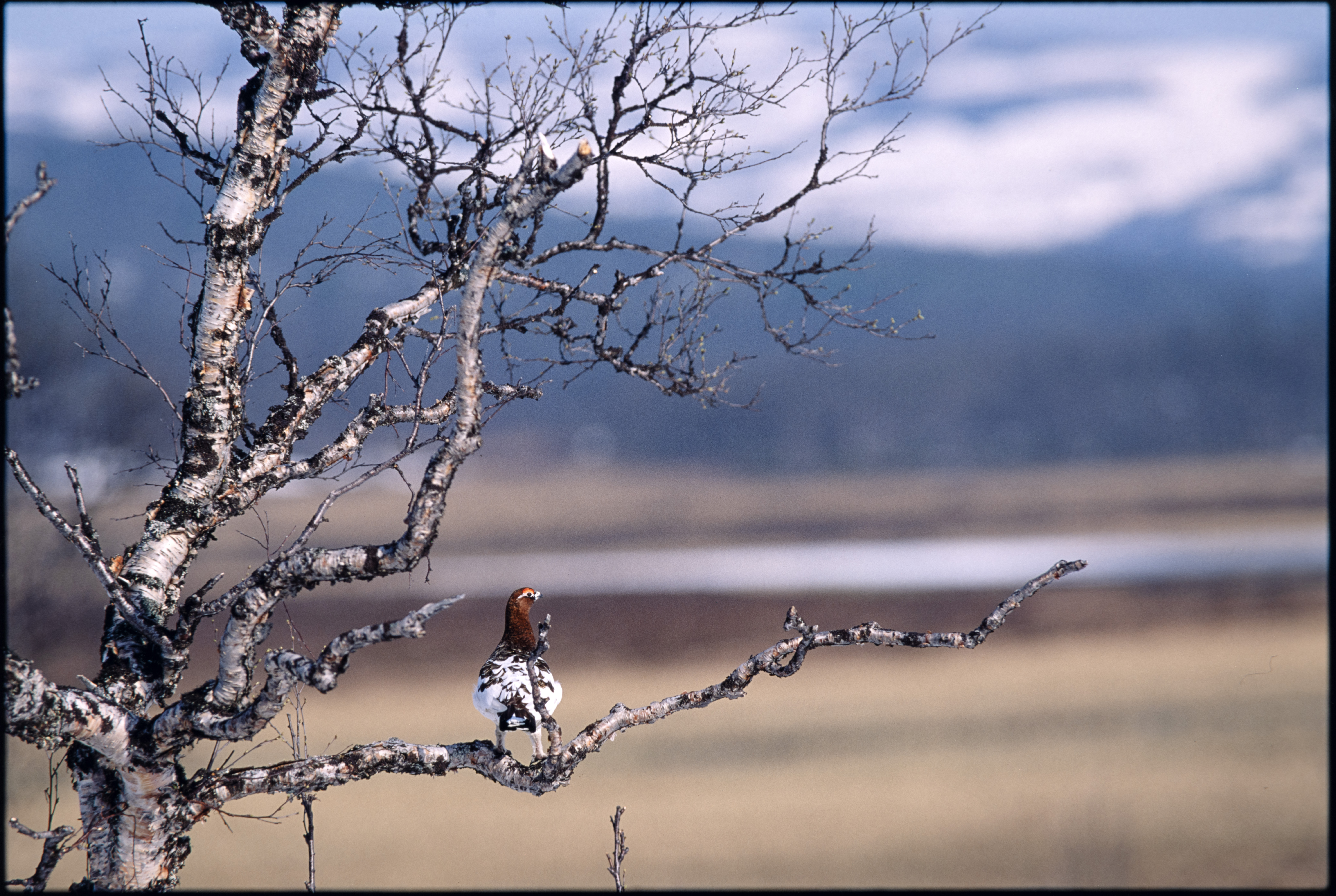 Lirype. Stegg i vårdrakt. På bjørkegrein i fjellandskap med myr, tjern, snø i fjellet
