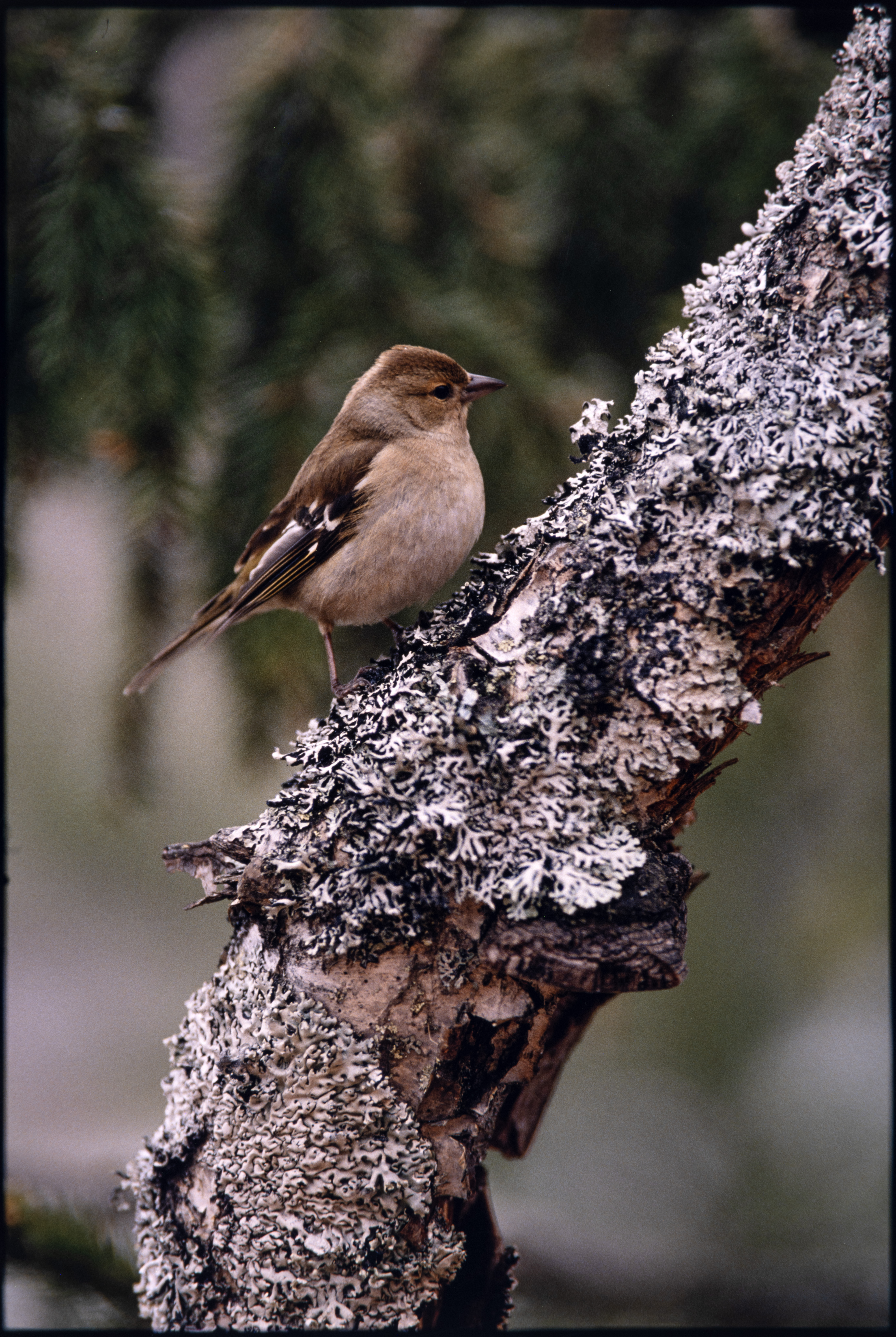 Grønnfink. Hunn på bjørkstamme med kvistlav