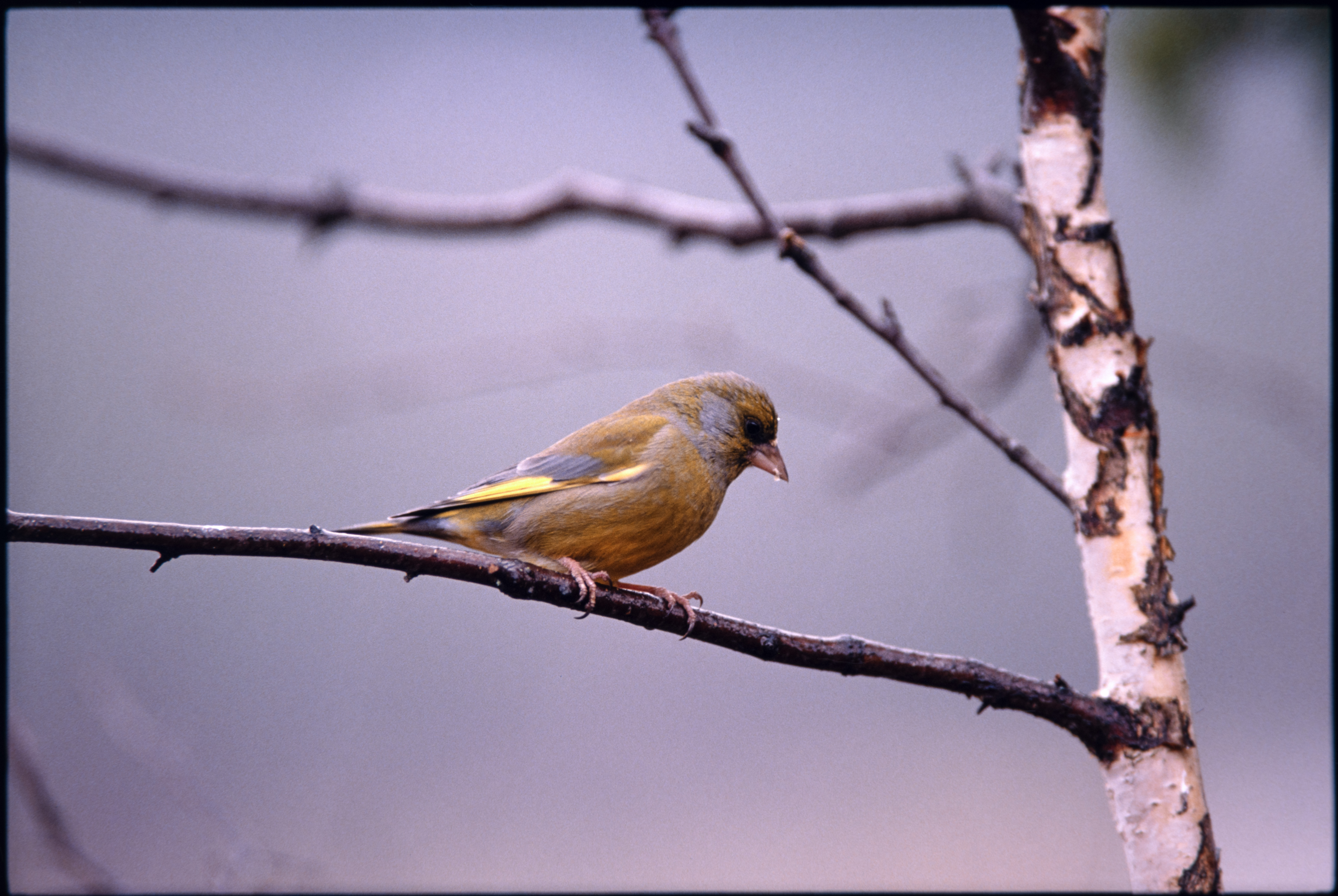 Grønnfink. Hann i bjørk