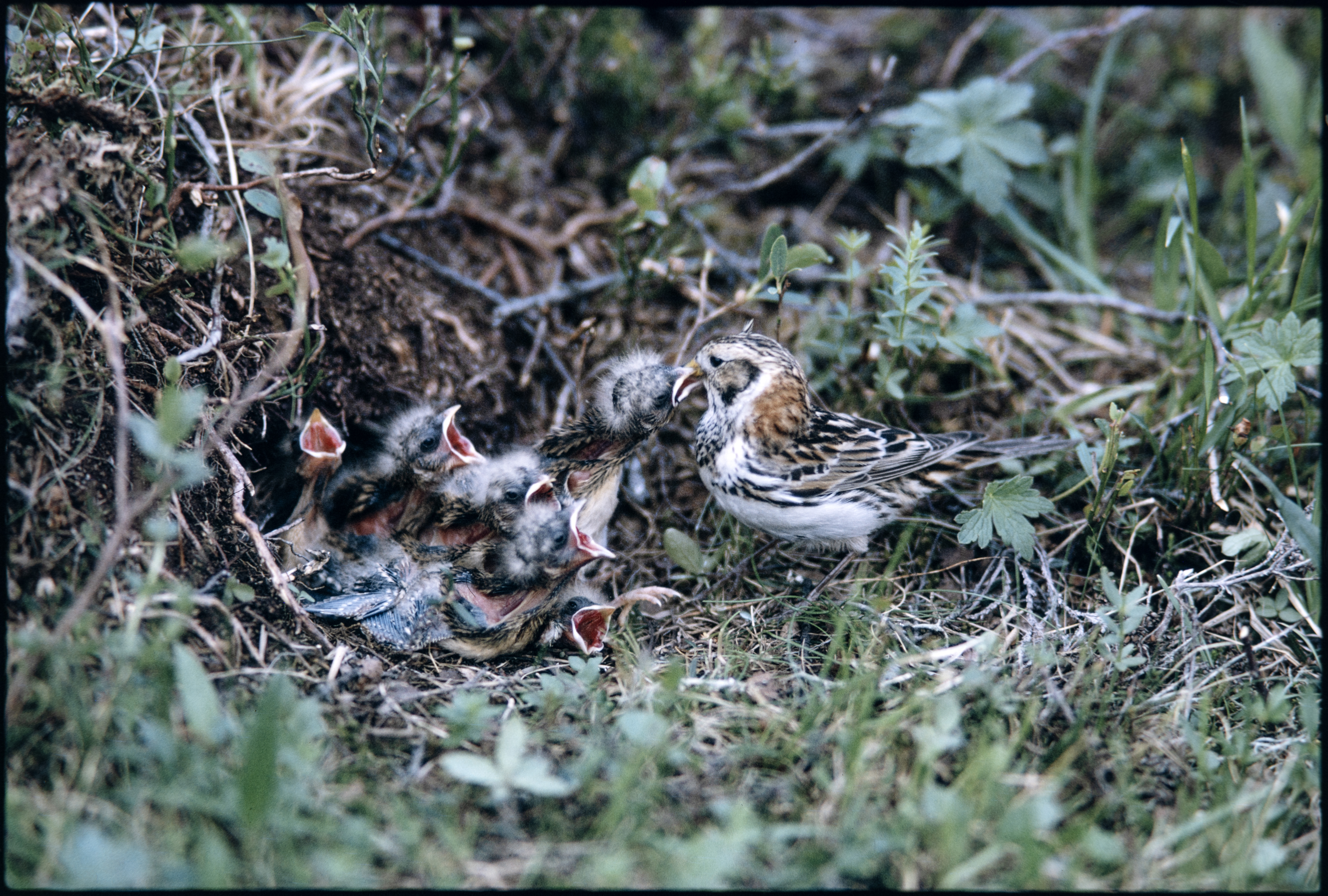 Lappspurv. Hunn som mater 5-6 unger i reir