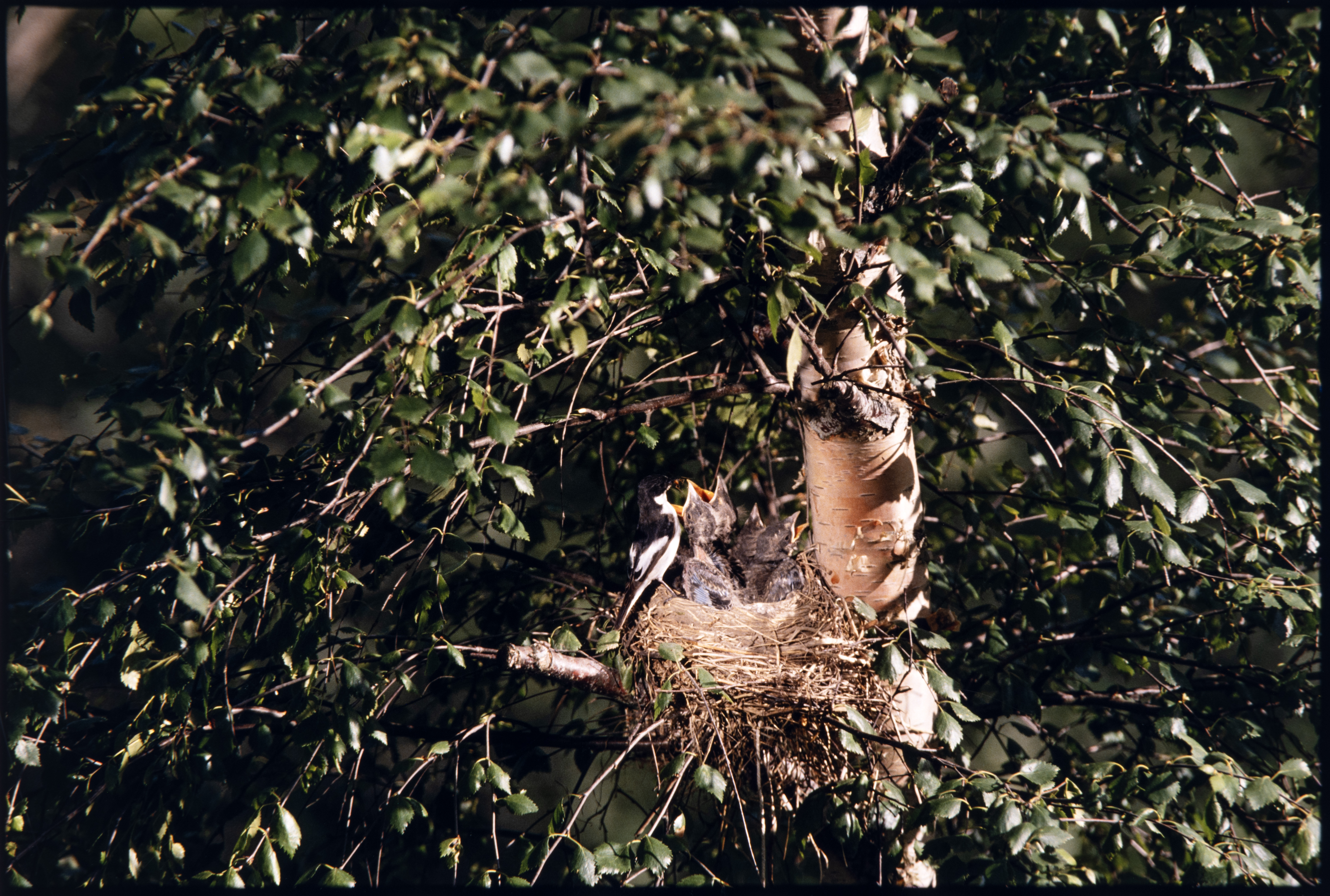 Svarthvit fluesnapper. Mater trostunger
