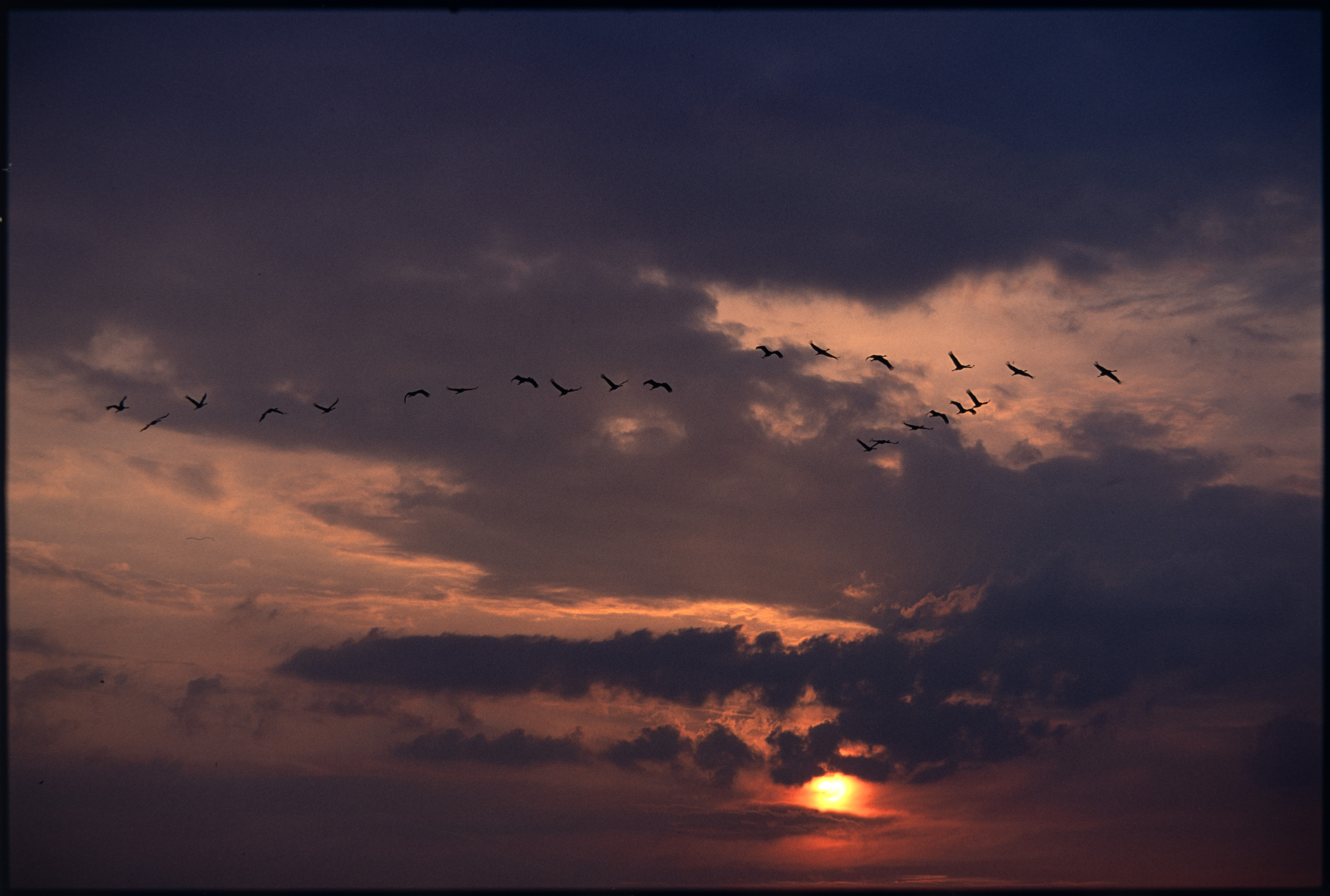 Trane. Flokk i trekk mot solnedgang
