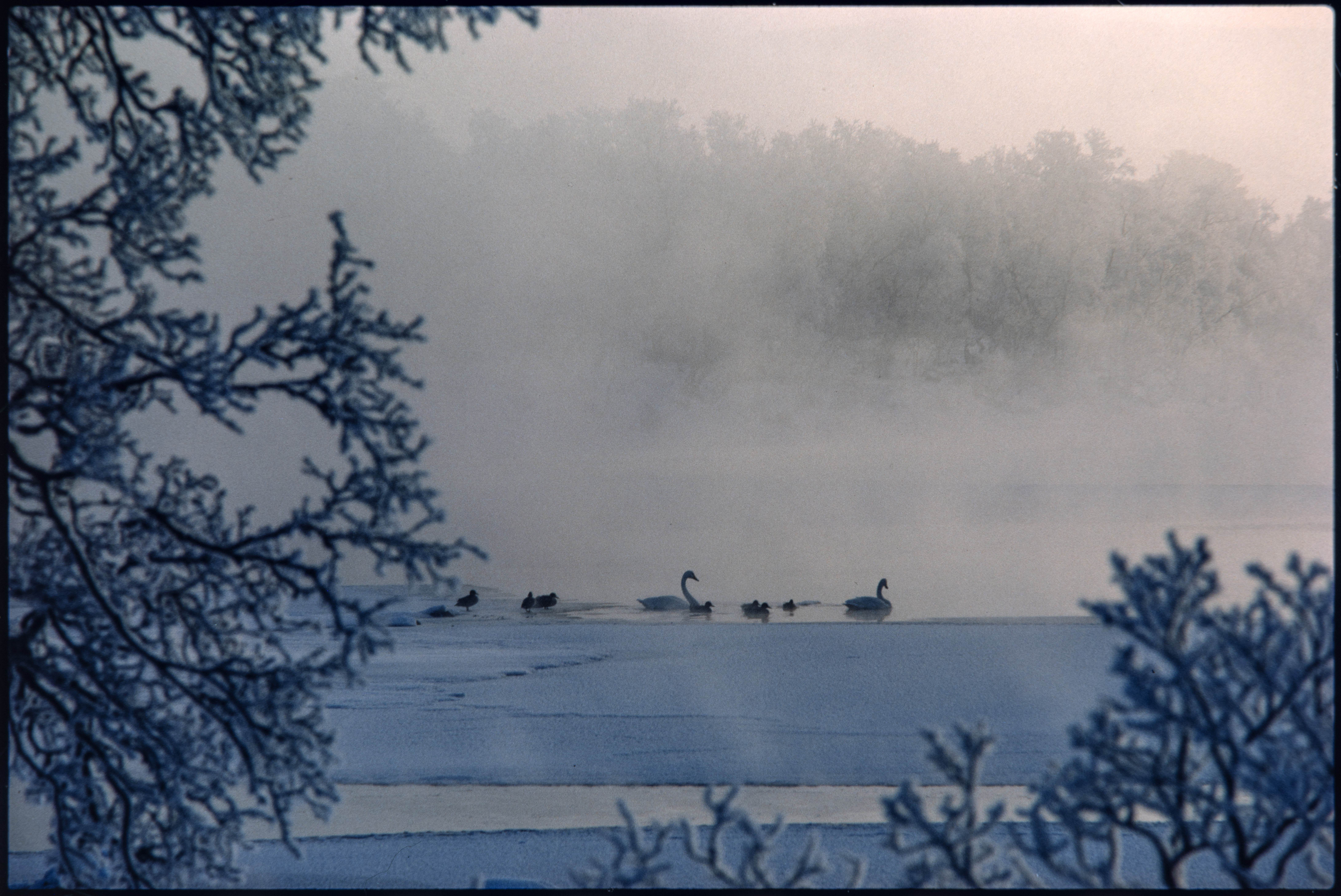 Sangsvane. 2 svaner og 7 ender på elv med frostrøyk. Krokhølen. Glåmos. Røros