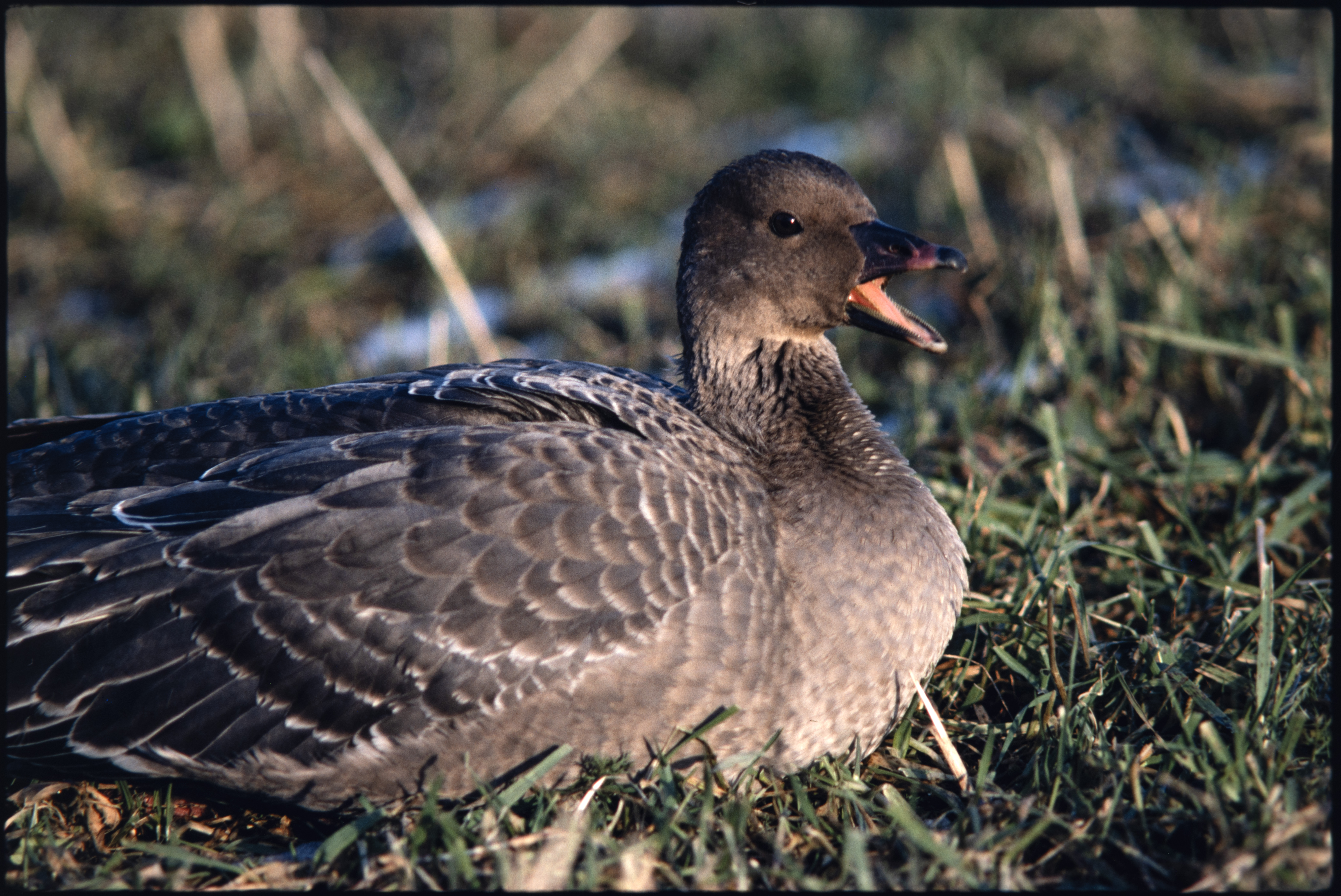 Kortnebbgås. Ligger i graset