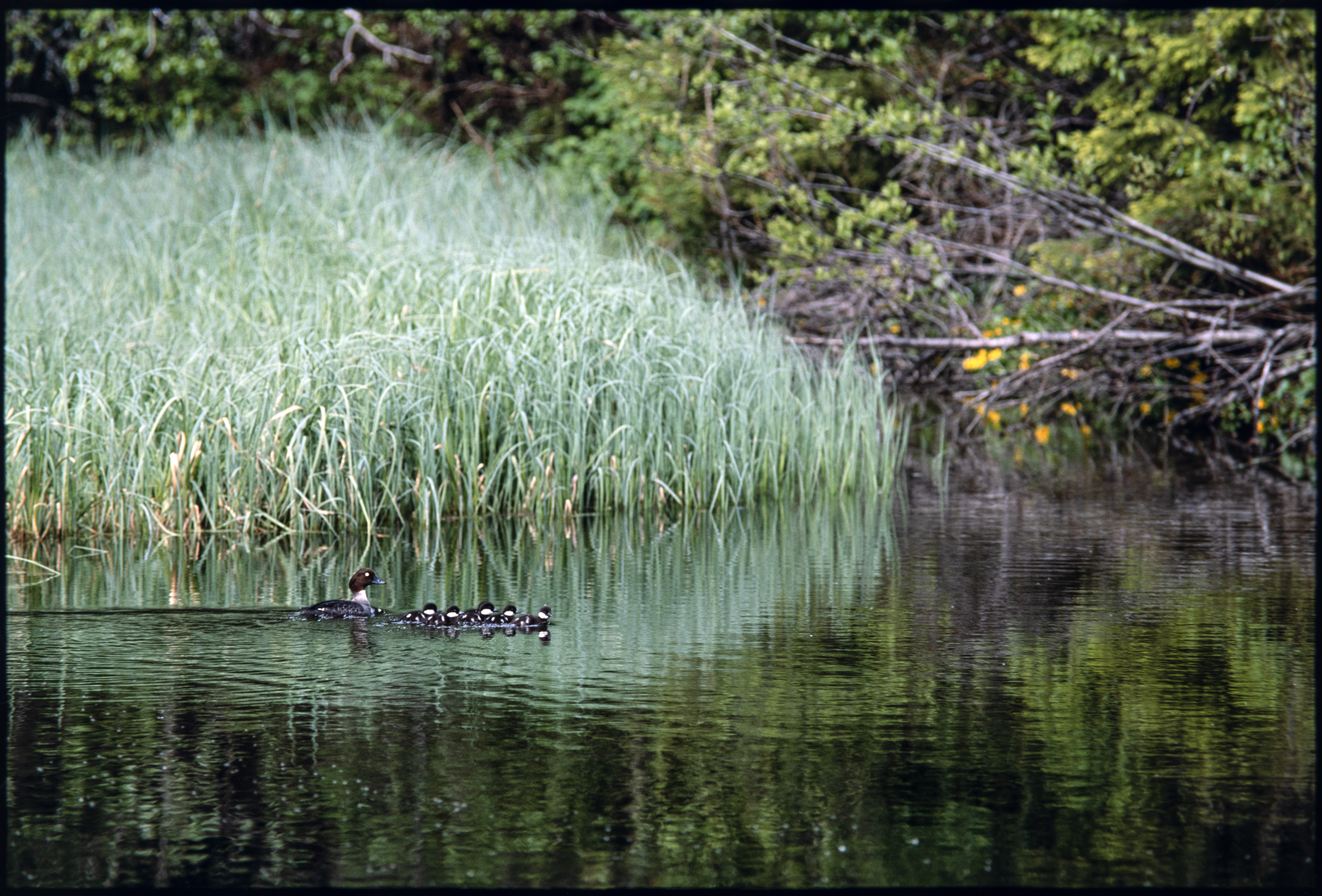 Kvinand. Hunn svømmer med 6 unger