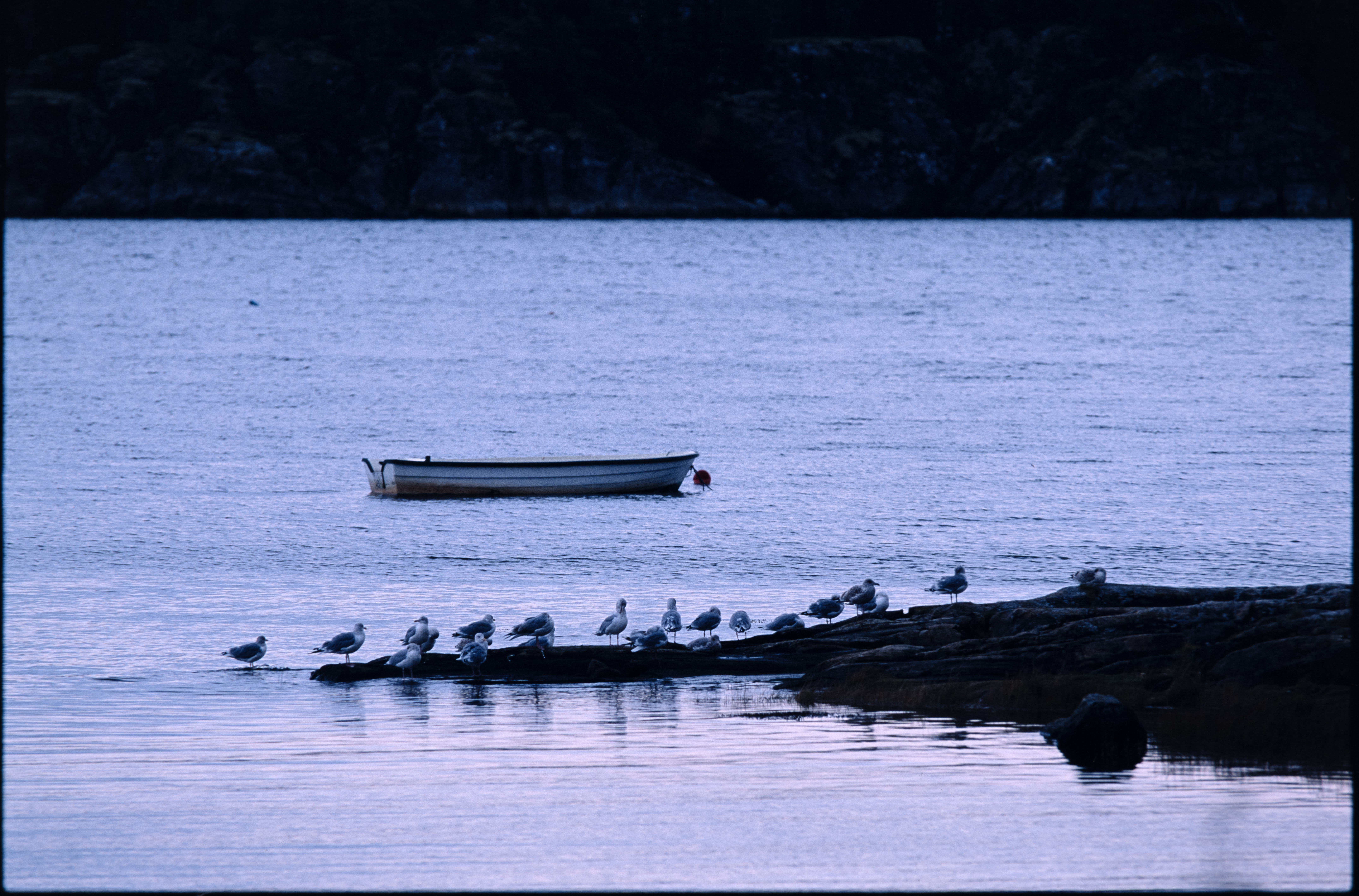 Fiskemåse. Flokk på svaberg ved ferskvatn. Båt i bakgrunnen