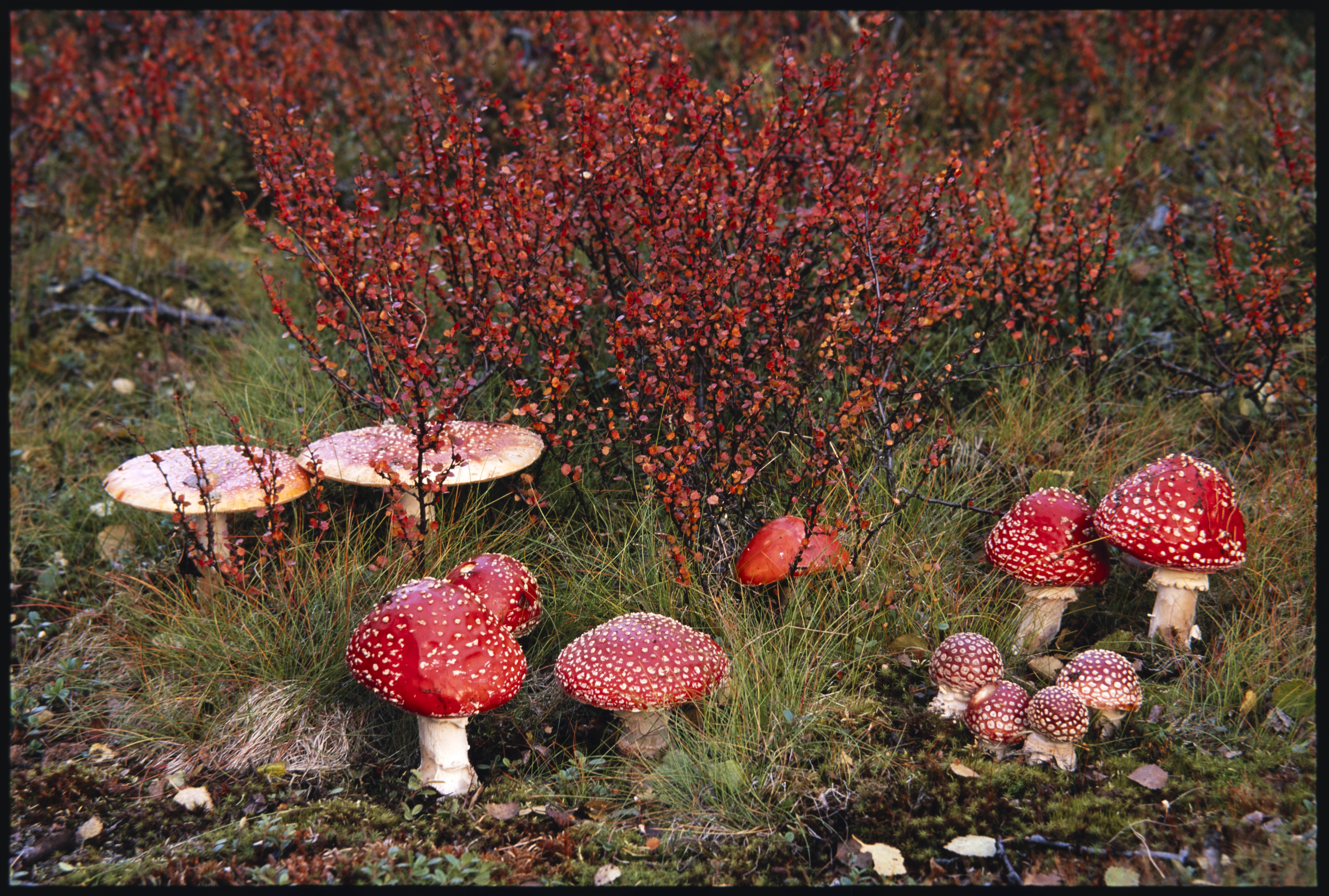Rød fluesopp, gruppe med 9-10 sopp i ymse stadier, dvergbjørk i høstfarger