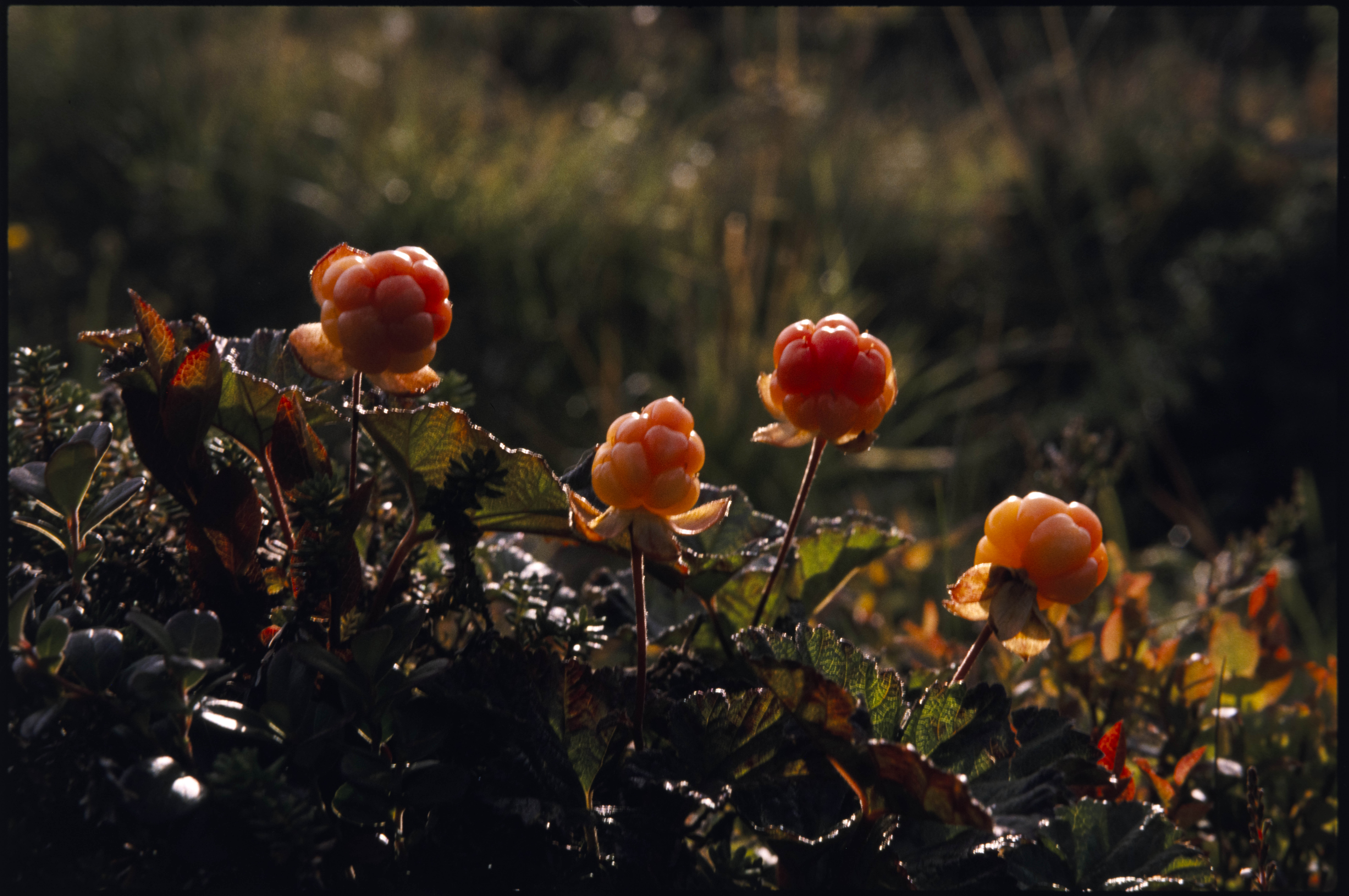 Molte, 4 bær i motlys. Holtålen, seinsommer
