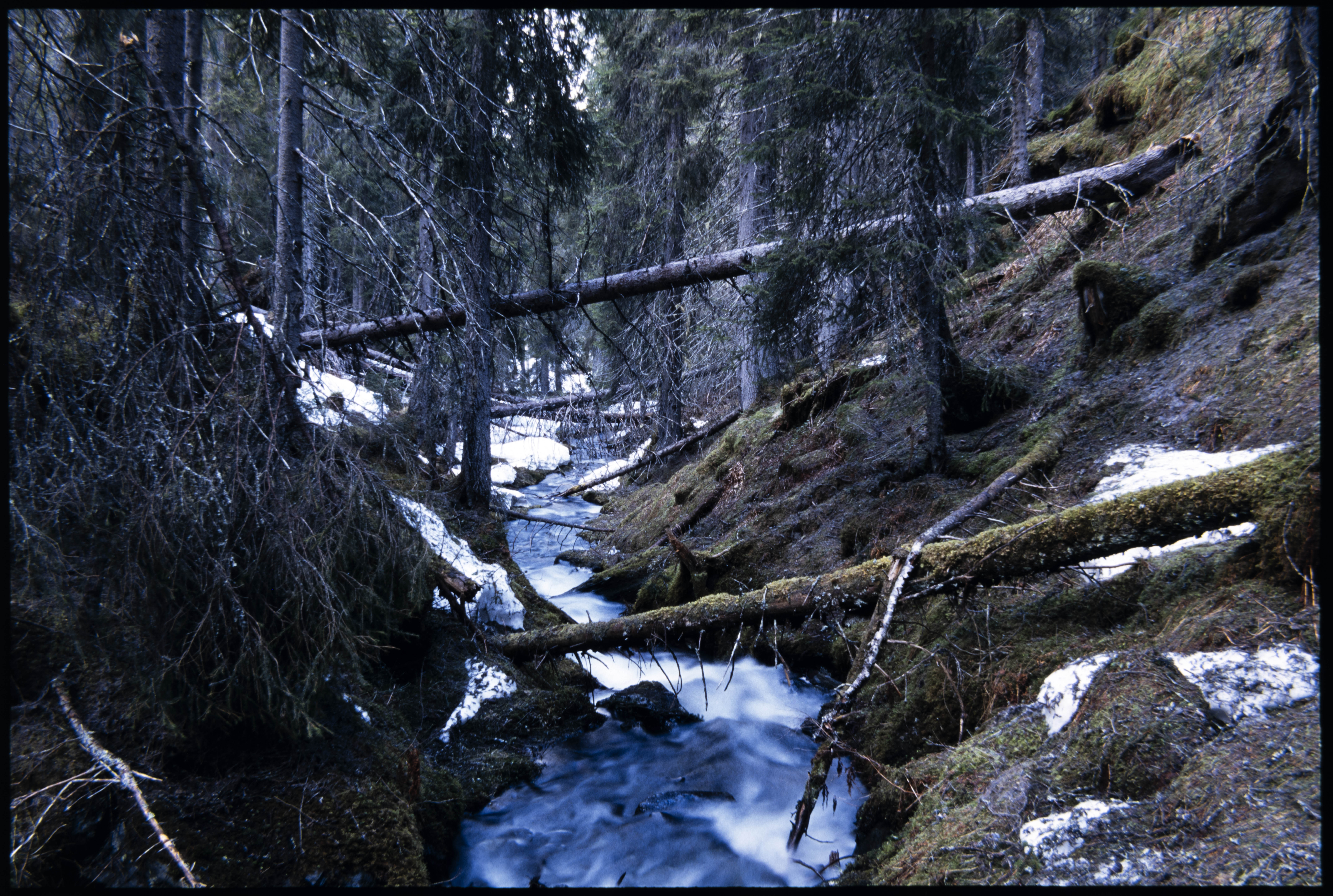 Gran, skog, bekk i vårløsning. Vår