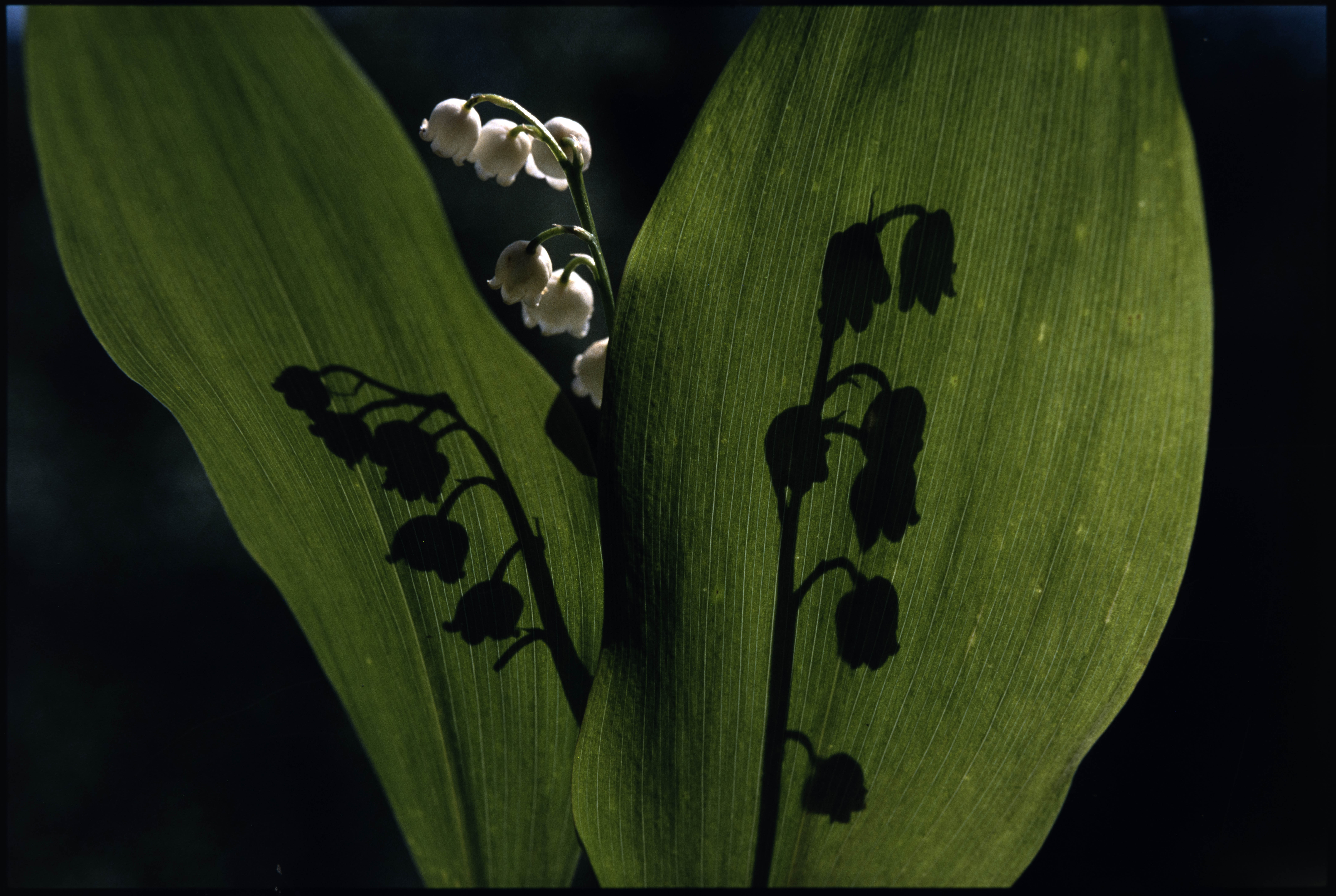 Liljekonvall. Blomsterstand og skygger av blomsterstander på blad. Tidlig sommer